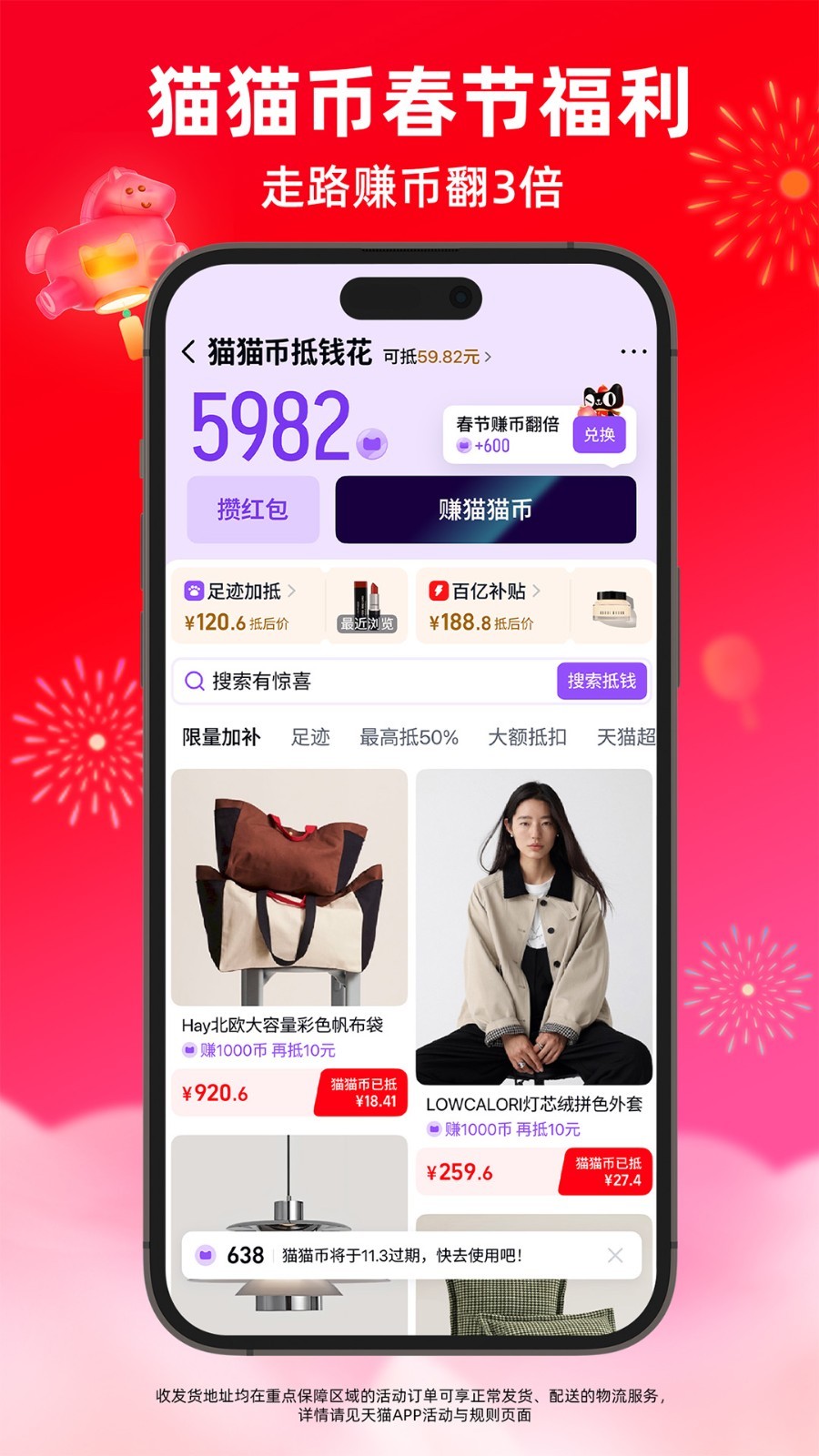 猫猫币:天猫下单即返猫猫币,海量商品下单可用猫猫币抵扣,折后再补至高50%,可叠红包叠消费券