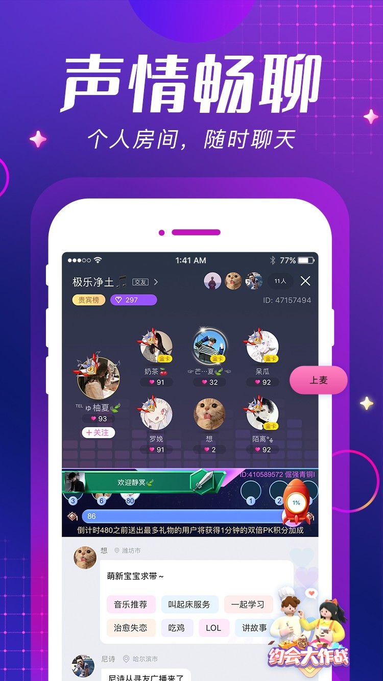你好呀,陌生人,你愿意听听我的故事吗? 你好呀,陌生人,你愿意说说你的故事吗? 在ME,让世界倾听你的声音,让你倾听世界的声音。 主要功能: 【随机电话】随机拨打电话,在声音的世界里卸下面具 【语音直播】不露脸,只有声音,一样可以做主播 【打招呼】遇到欣赏的人,就先从打招呼出发吧 【寻友广播】茫茫人海中,寻找知心人,广播大声说出来