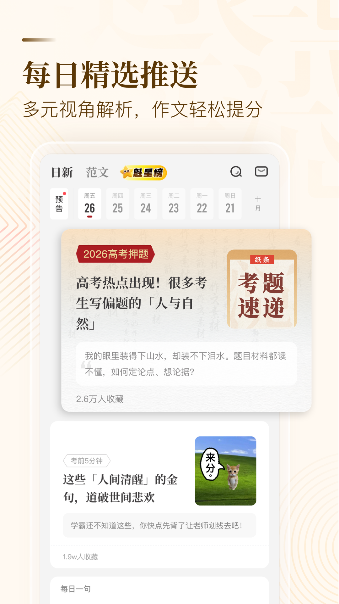 小众高分素材、中高考标杆范文、好词好句、万能模板、经典人物、写作技法、……每天0点更新,并按中高考常见的20+主题精细分类,一搜就有,多到用不完!