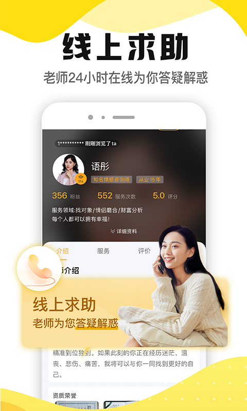汇集海量情感咨询师、婚姻家庭咨询师等,还有海量的精英倾听者,为您提供恋爱心理、婚姻情感、挽回前任、婚姻修复等个性化的1对1在线情感咨询服务,帮您重获幸福。