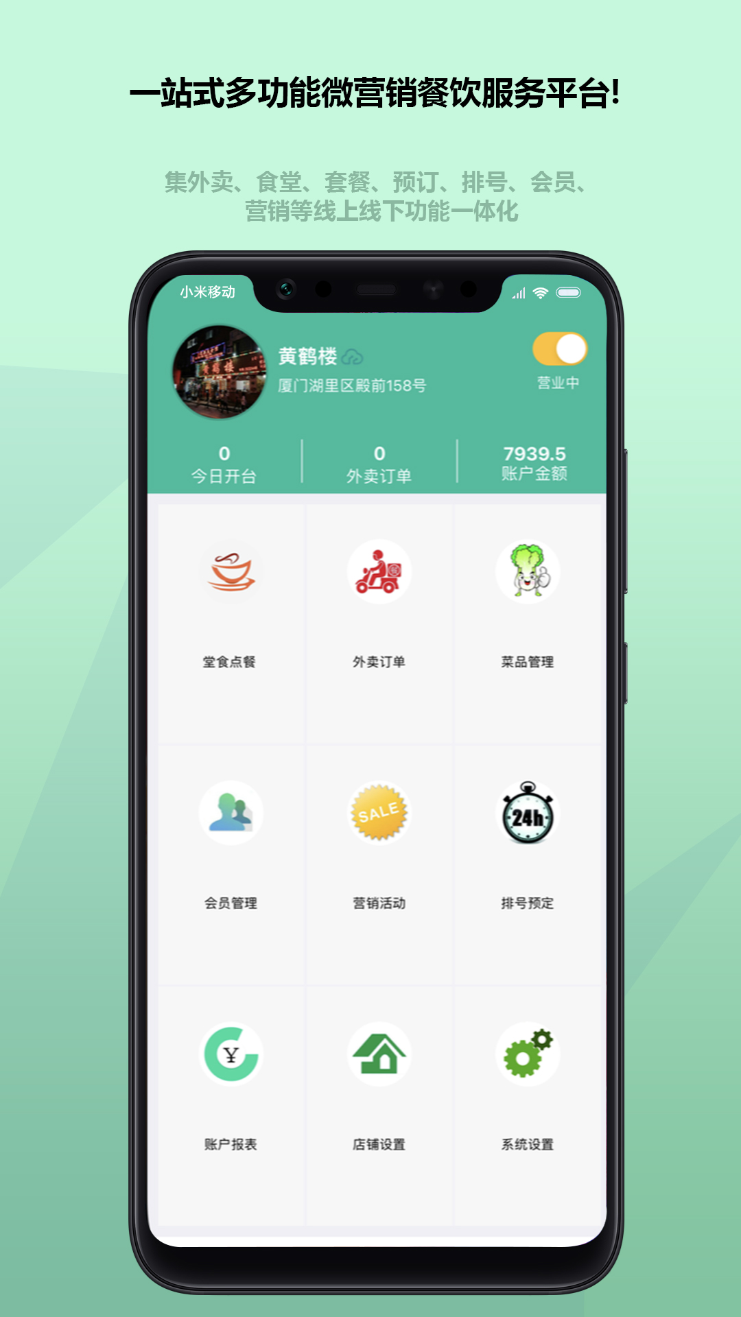 集外卖、预订、微信点餐、在线排号等线上线下功能一体化。
