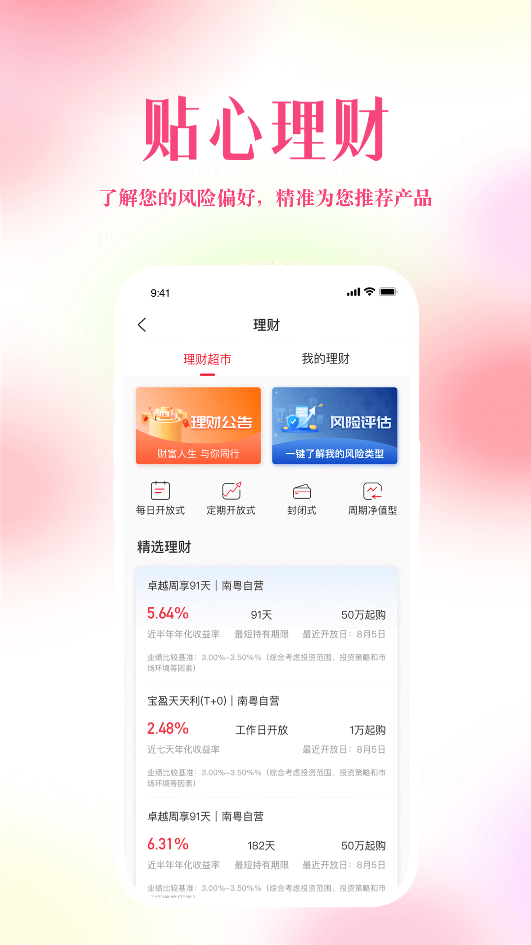 应用详情:广东南粤银行手机银行,融合智能手机特性,采用当前主流的、新颖的扁平化设计理念,为您带来全新的操作体验,让您尊享畅快自如的移动金融生活!它具备丰富的产品功能、良好的用户体验、完备的安全控制,是您的移动理财好帮手。