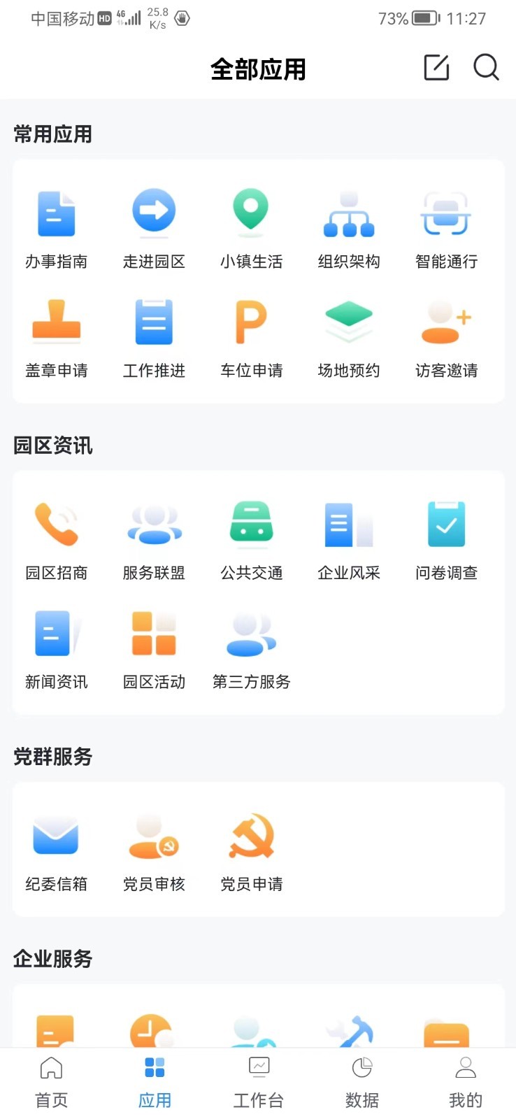 应用详情:数智e港,是为杭州湾信息港的园区管理者,园内企业,企业员工、访客人员打造的一款移动便捷APP。整合了园区公告、会议室预定、物业报修、访客申请、停车缴费等服务,并同步植入了园区党建、政策解读、企业风采、服务联盟模块,为每一位用户营造更安全、更便捷的一体智慧园区生活体验。
