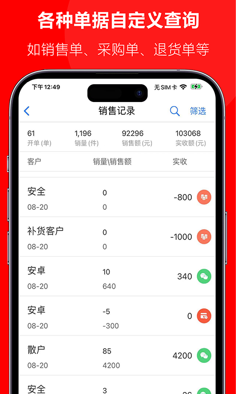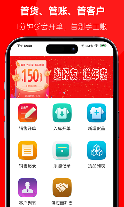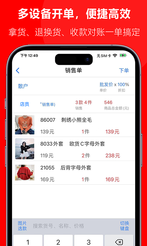 【主要功能】 销售单:早上到货还没时间入库,可直接输入货号直接开单,网络不好也能先开单,不影响做生意。 货品:上传商品时可直接入库,也可查看货品库存、销售、客户拿货情况。 报表:有销售、采购、调货、盘点、调货、经营报表等各种报表。 客户:有客户帐、供应商账、客户档案、供应商档案等,可随时查看分享账单给客户对账。 支持多店铺、多店员同时操作,老板能随时用手机查看店铺的货品、客户、报表等综合情况。
