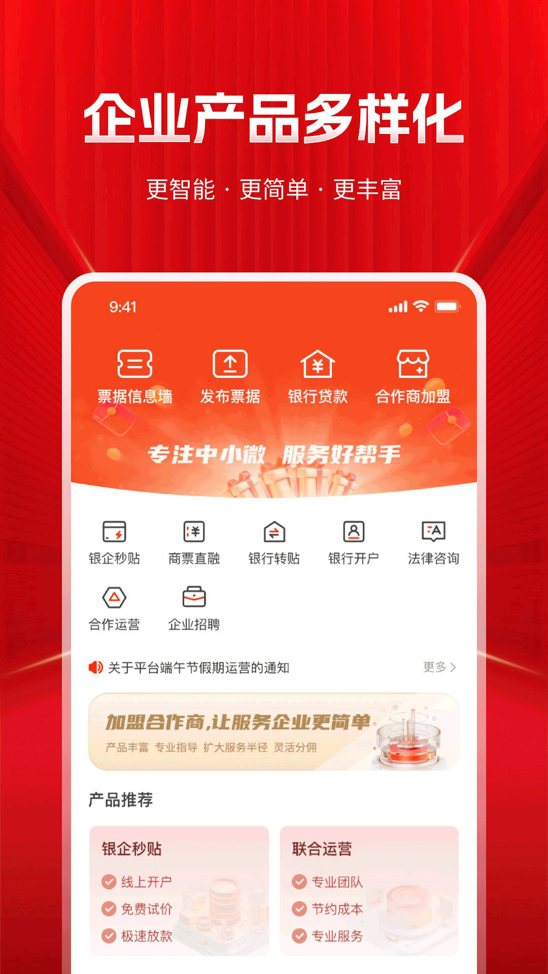 票据产品:帮助企业实现票据转让、贴现、融资等多元化企业融资方式,让企业快速获得资金,增强资金流动和成本节约。