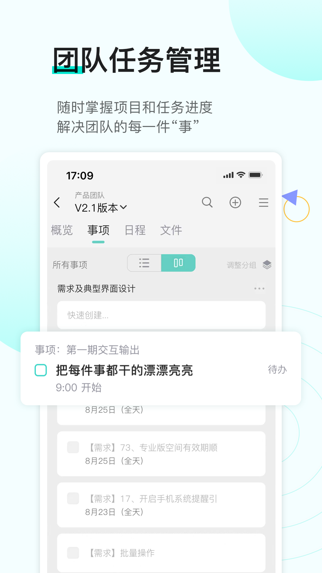在一处轻松达成个人和协作的任何事项,在一处专注沉淀每一次的思考和成果。让一切事务井井有条,过程历历在目。做时间的主人,遇见更卓越的自己,成就更高效的团队。