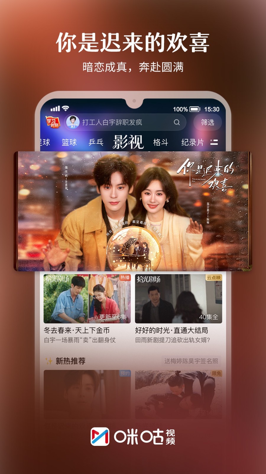 电视剧《冬去春来》看七个身影并肩向前倔强生长;《你是迟来的欢喜》看套路之下两颗靠近的真心,试探之间双向奔赴的爱意;《好好的时光》看七口之家四十载风雨,重组家庭故事照见父母辈的青春。电影《飞行家》看笑中带泪,东北下岗工人热血“飞天梦”;《猎杀游戏》看为赚10亿,被全国直播追杀1个月。综艺《最强大脑第十三季》看五大脑王操盘脑力俱乐部;《大侦探11》看“侦”心未改,继续赴真相之约。上咪咕视频,给你好看!