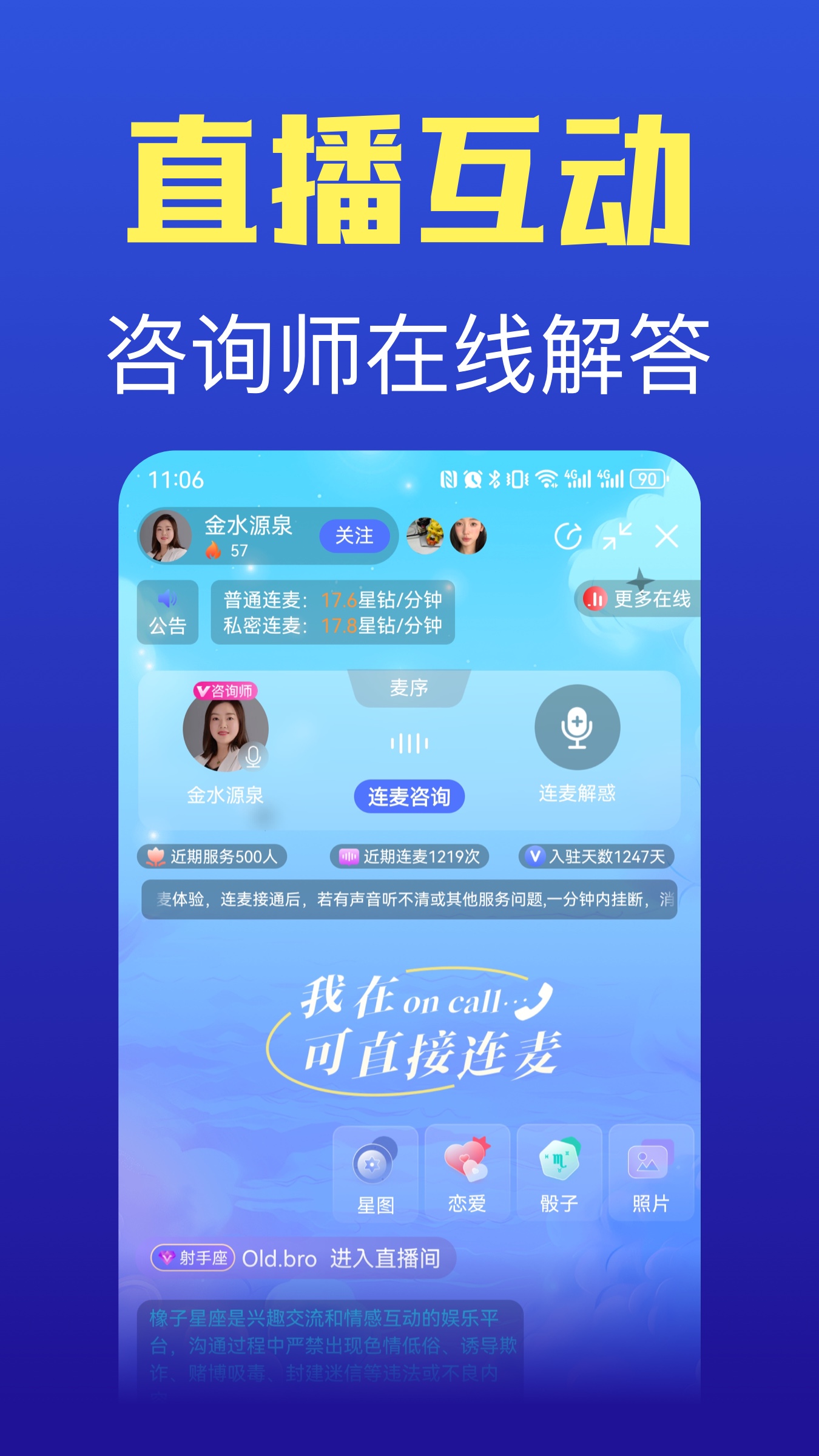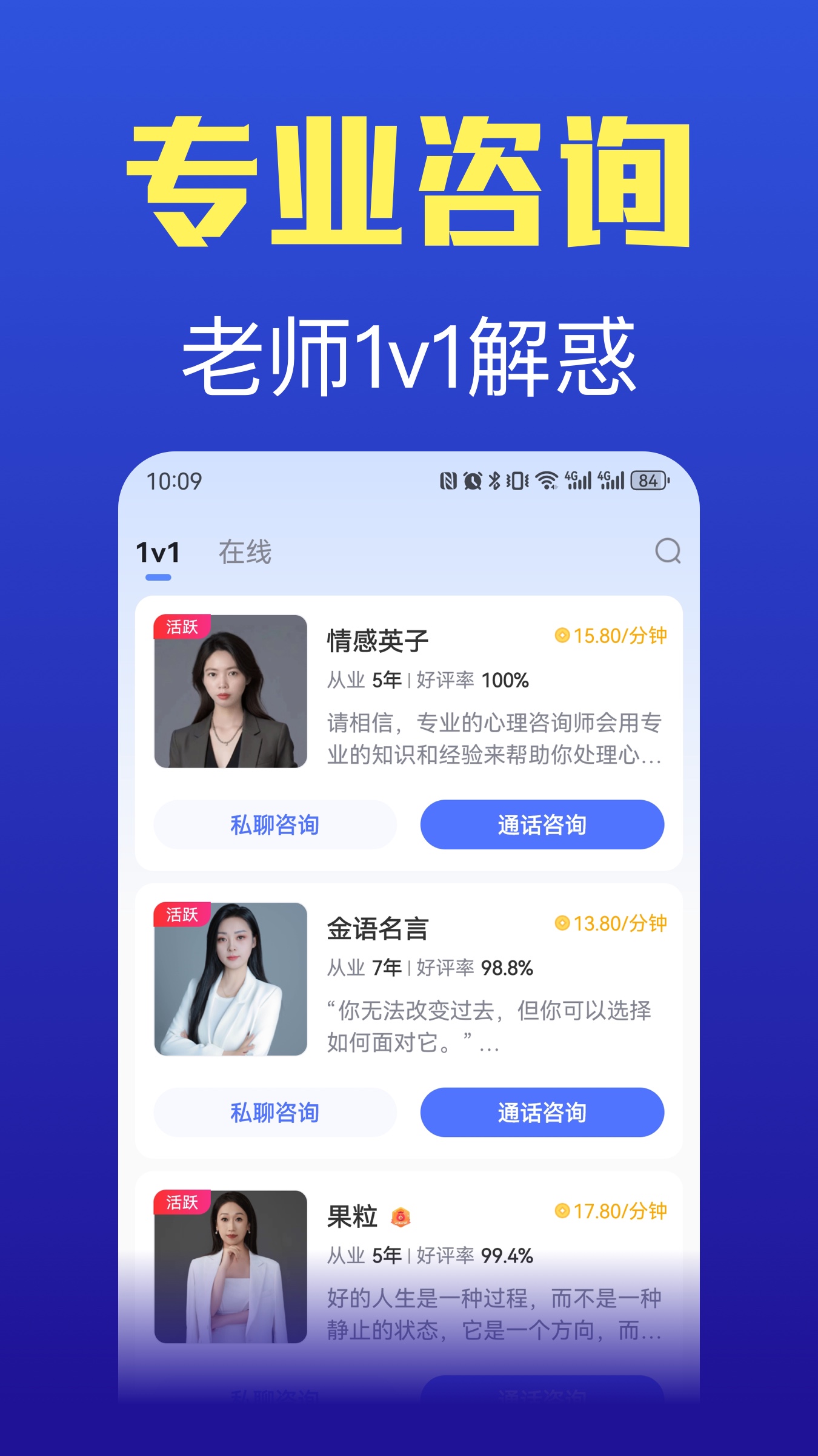 上万专业心理咨询师24小时一对一语音通话服务;实时分析解答用户的情感问题,帮您快速的决断心中疑惑,给出专业建议。