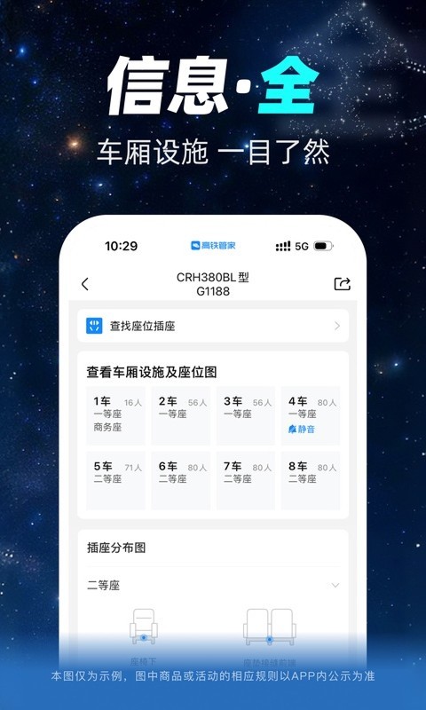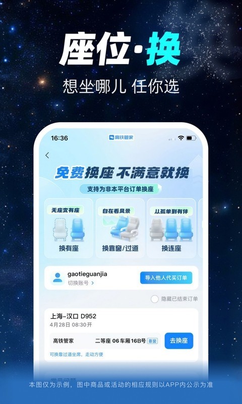 - 在线选座服务,可选择指定席位、车厢,支持在线换座