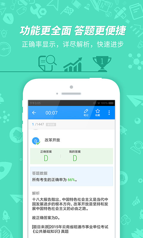 含在线做题、逐题解析、每日竞赛、错题收藏、考生笔记等丰富功能。匹配安卓手机系统,一机在手,考试无忧。