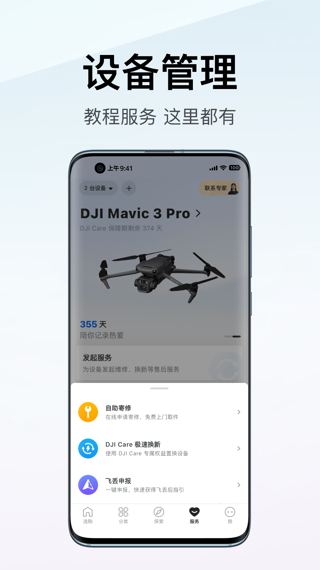 1. 记录陪伴,查看设备使用时间和 DJI Care 保障天数。