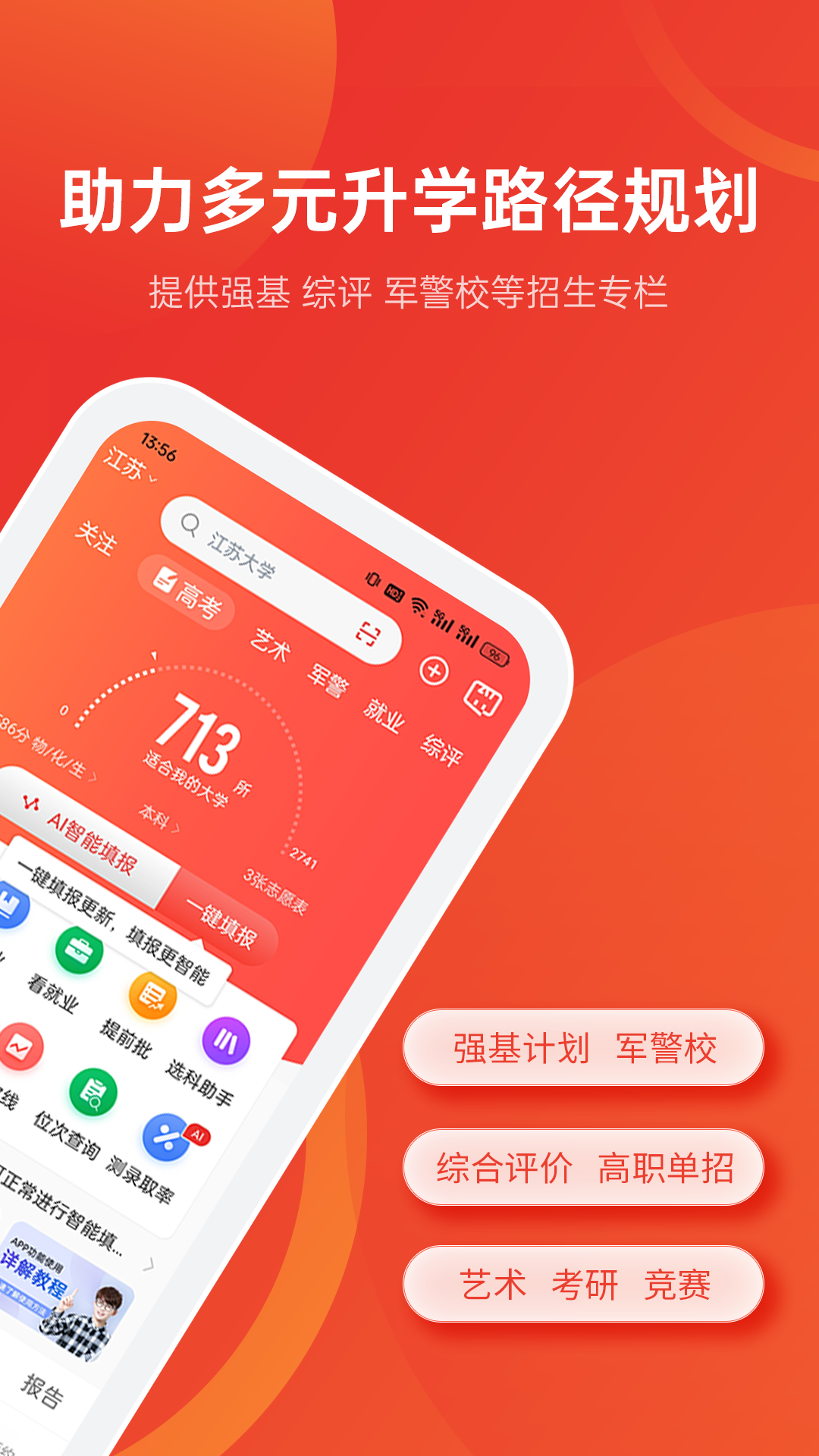 优志愿专注于为广大考生提供多元升学规划服务,覆盖30省市,提供在线AI高考志愿填报、美术志愿填报、军警校、强基计划、综合评价、高职单招、竞赛、考研、就业等全方位服务。迄今为止,优志愿已累计服务2000万+考生,帮助他们成功实现升学梦想,成为考生和家长们都信赖的教育APP。