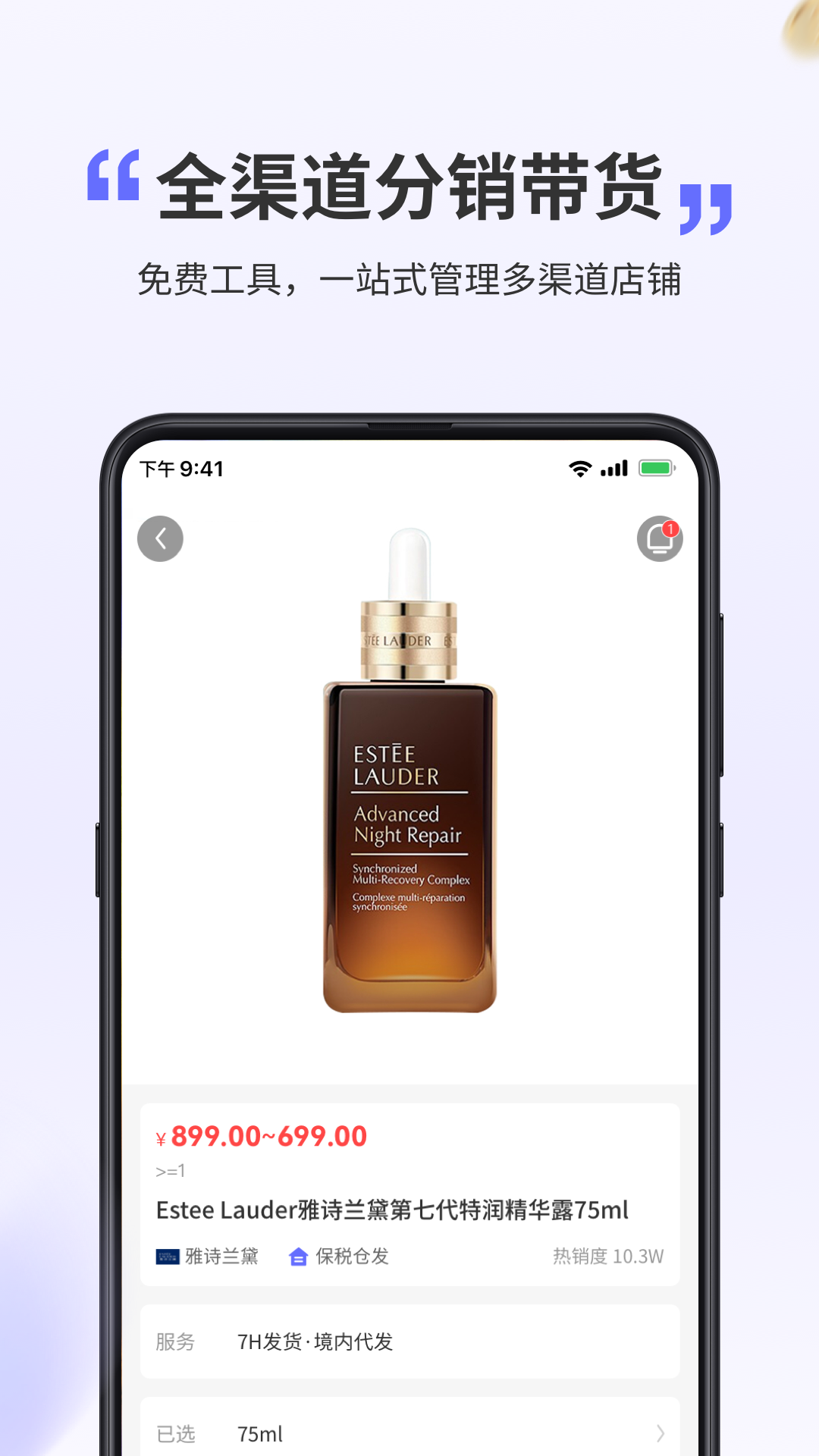 3、享一件发货:支持一件发货功能,保税仓直发,让广大商家不用囤货,没有库存压力,轻松下单。为您提供专业的服务,省心!