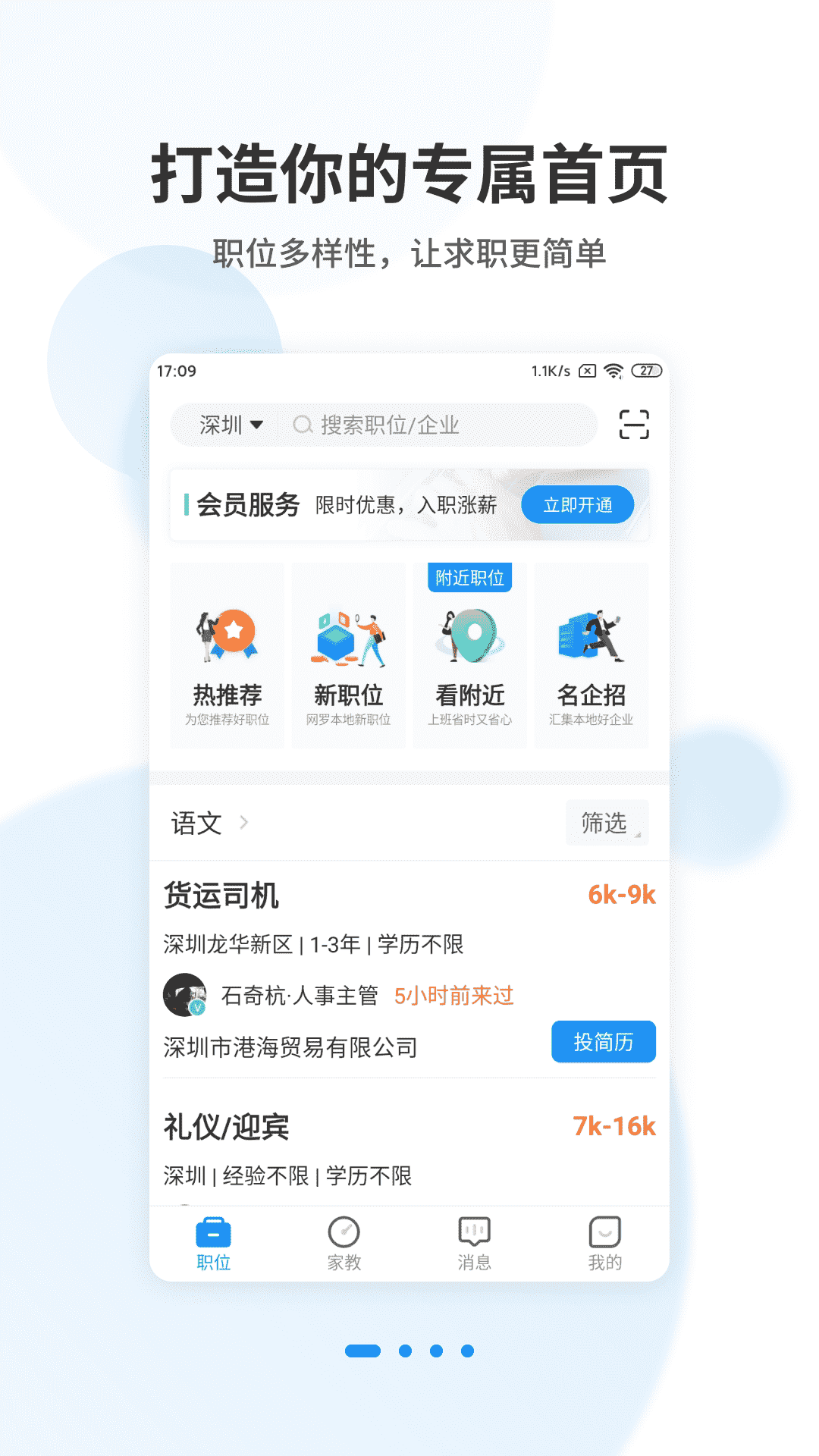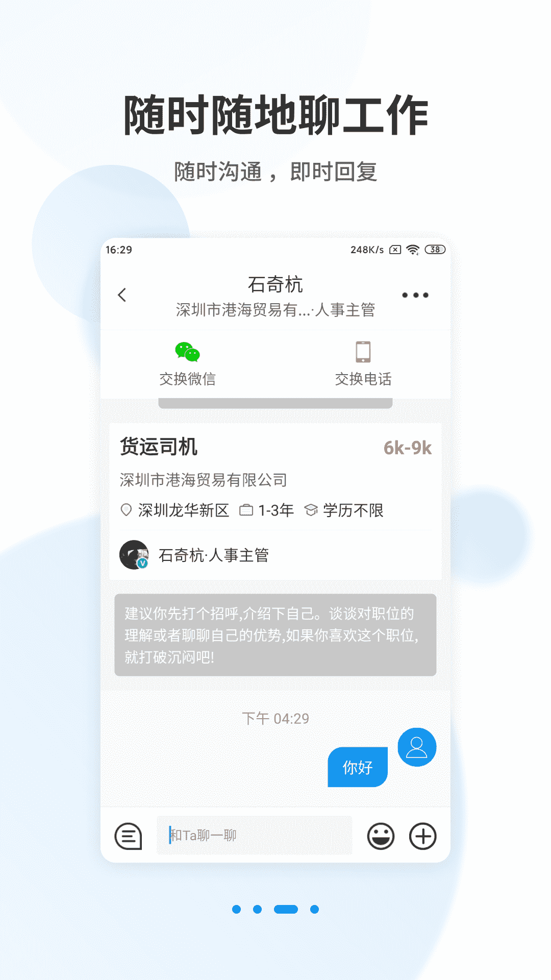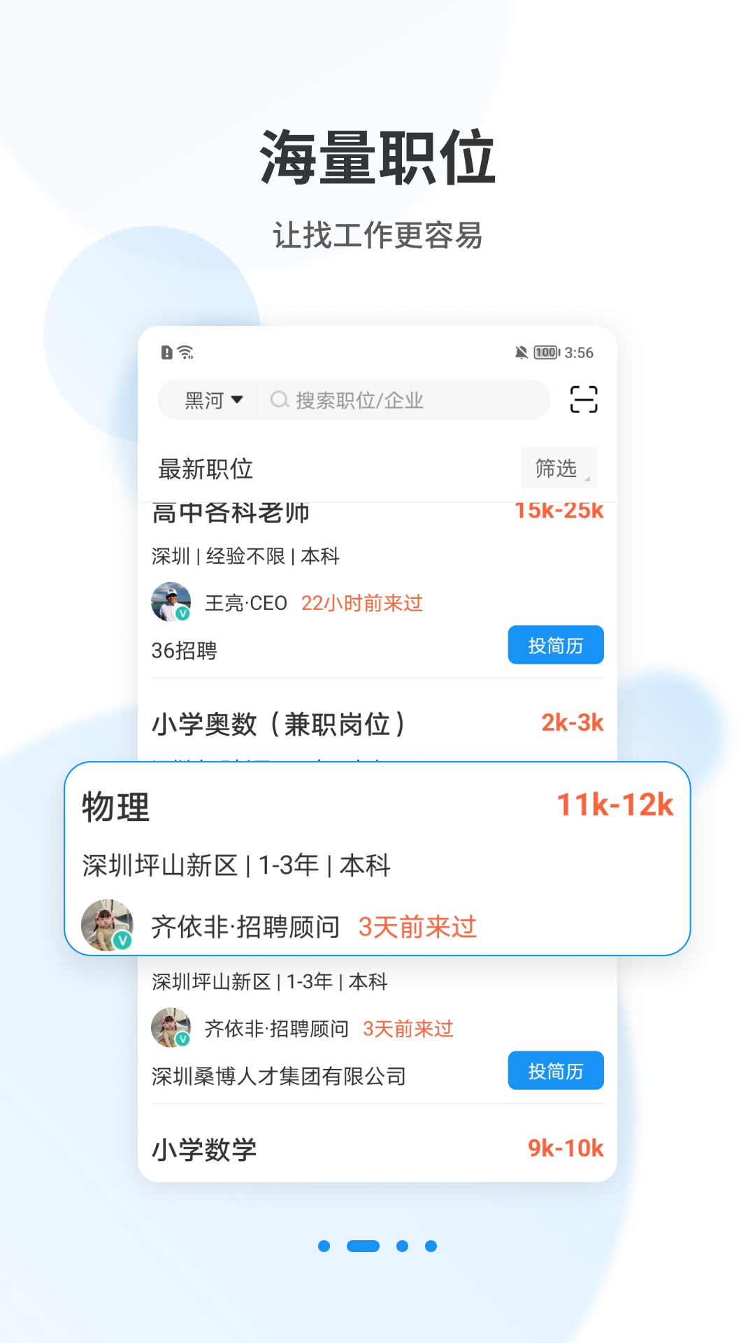 ①1小时到岗; ②直接与拍板人沟通; ③聊天搞定工作! 招聘界的微信,无需投简历,聊天拿offer,闪电入职。 设有单位屏蔽功能,完全保障你的个人隐私!严格的职位审核机制,虚假信息零容忍!