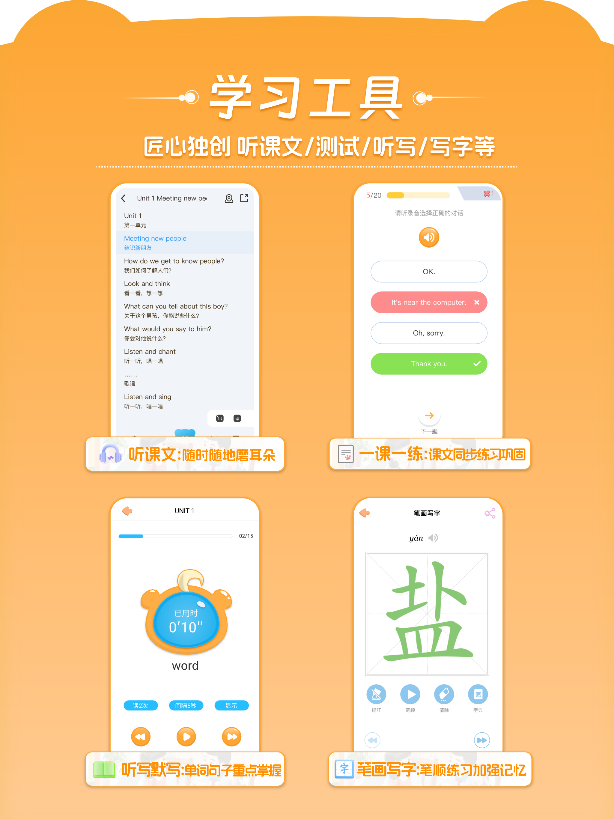 ★ 大招六:8大学习工具——包括听课文、测试、听写、口语、朗读、写字、英汉词典、汉语字典。全新推出★听课文★,让孩子随时随地磨耳朵,巩固课文内容。