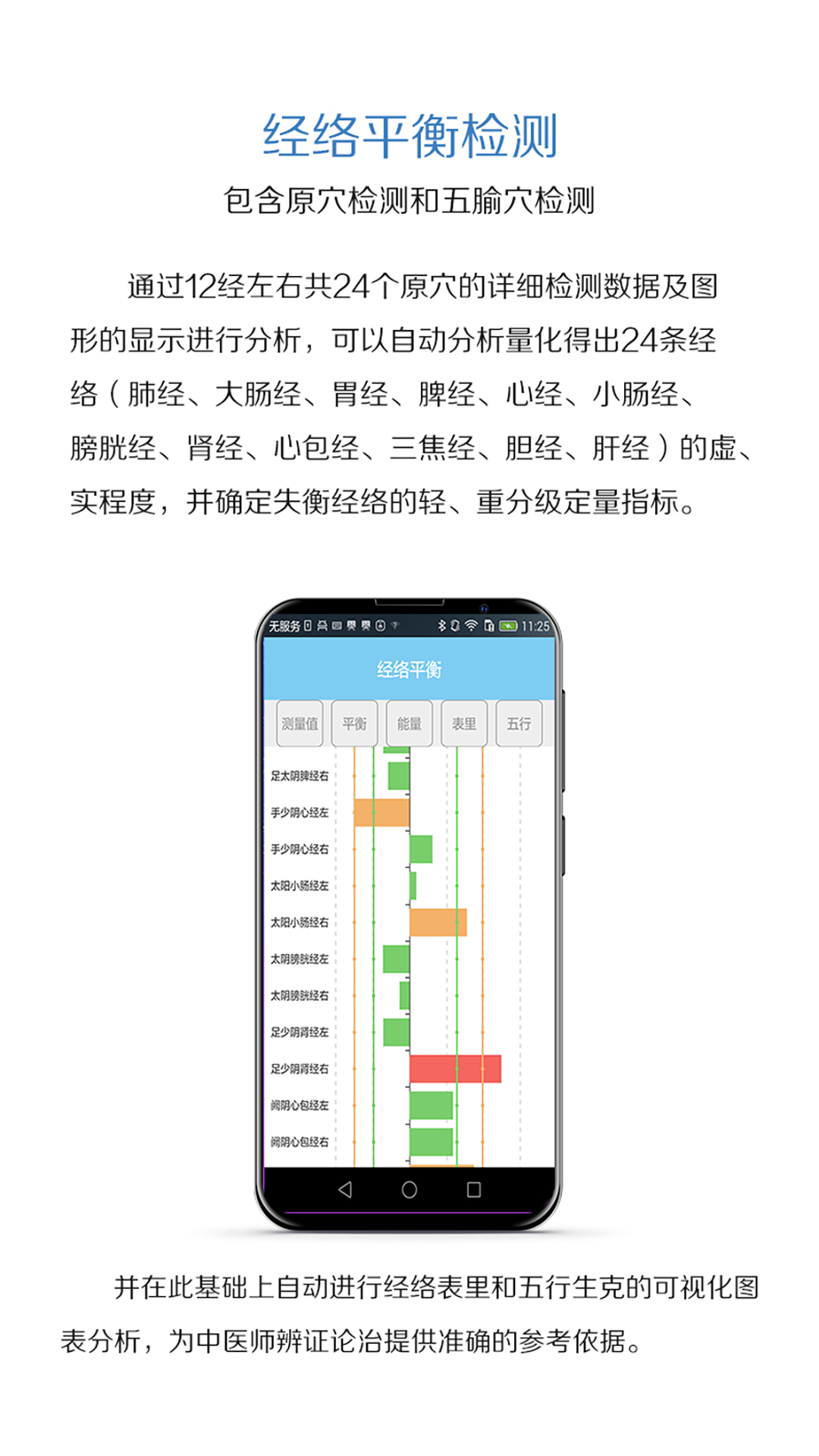 针对从事中医经络工作者和爱好者进行学习、检测、科研与辅助干预而设计,帮助初学者掌握经络的知识、检测方法、分析结果和指导用穴,并对专业健康管理人员开展经络检测、科研服务和健康风险特色辅助干预,结合手机应用软件实现方便快捷的操作使用。