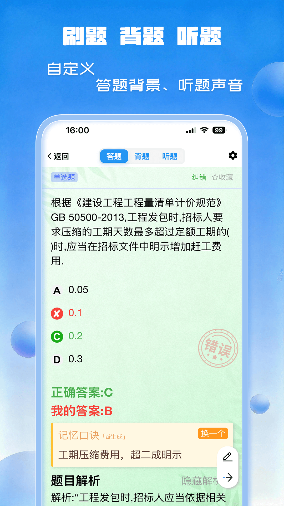 应用详情:职业资格考试题库大全,手机智能导入题库,支持十余种常见题库文档格式,无需整理文档一键导入题库、悬浮窗搜题快速高效、整页搜一次搜20题、超强错题本功能齐全、模拟考试,试题练习,错题回做,随机出题,语音听题、扫一扫搜题、拍照搜题、关键字检索答案、各种新职业考试题库,轻松通过考试。 智能导入、导入试题、导入文档、导入题库、上传、上传题库、上传试题、制作、制作题库、制作试题、自制题库、整理题库、整理文档、考试题库、职业技能鉴定题库、 包含题库:茶艺师、辅警、列车长、信贷、普速、通信、护理、应知应会、电网、毛概、 消防、铁路线路工、星级、电力、变电、货币、会计、动车、配电、检车员、维修电工、车辆钳工、物流、煤矿、供电、无人机、育婴师、铁路、驾驶员