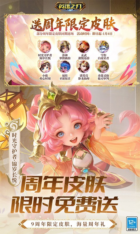 9周年庆活动正式开启!登录游戏参与活动,即可免费领取新英雄噬魂法师及9周年限定皮肤时光守护者-锦岁长悦。更有9周年专属装饰资源及海量道具等你来获取!