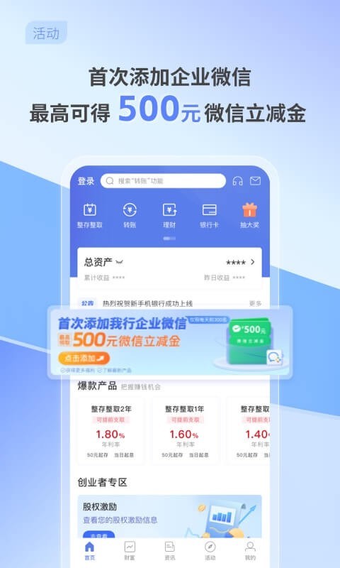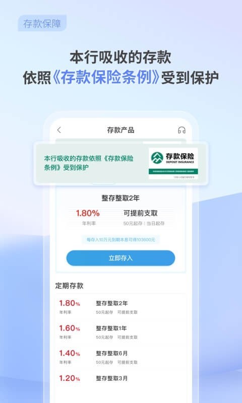 应用详情:北京中关村银行APP有年利率1.80%的二年定期存款产品(每存10万元到期本息可得103600元),本行吸收的存款依照《存款保险条例》受到保护,可在线开立存款证明,同时为您提供银行存款、投资、信用借款等一站式金融服务。