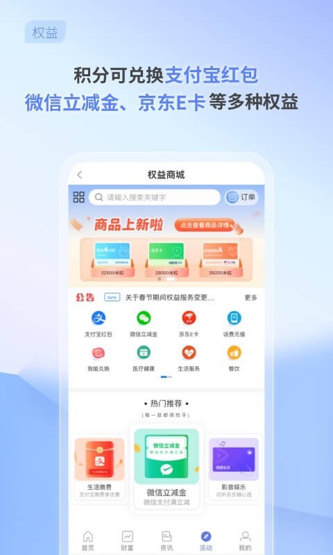 【营销活动多】不定期推出爆款活动,使用APP功能、分享互动均有机会赢取权益积分,多种新人礼遇等待您选择。