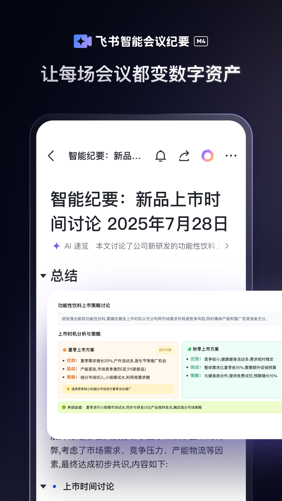 - 智能会议纪要:AI 时代的智能会议解决方案,提供会中实时总结,会后全面回顾,精准的会议纪要、待办提炼,让会议结论更好的落地、会议内容充分沉淀、可进一步被 AI 消费,让每场会议都成为组织数字资产。[应用成熟度:M4]