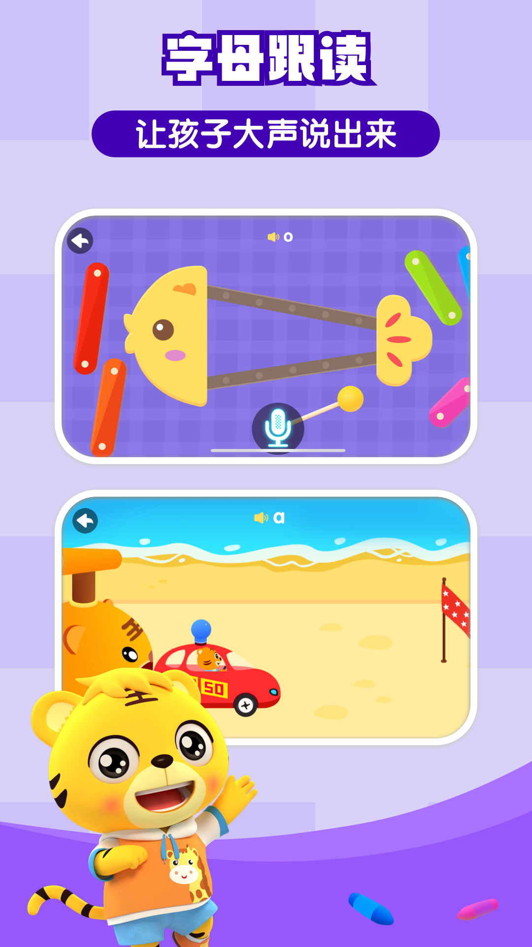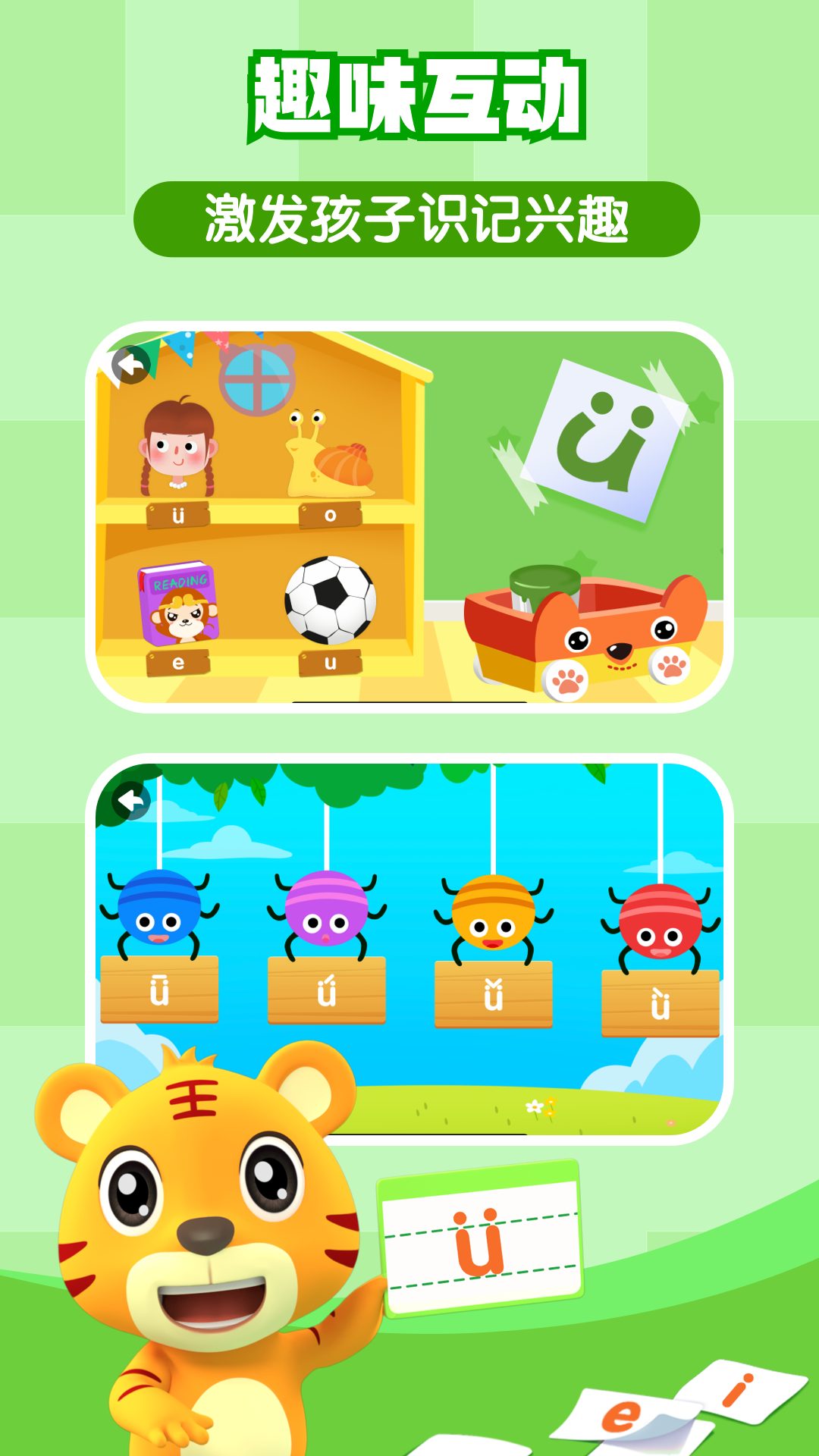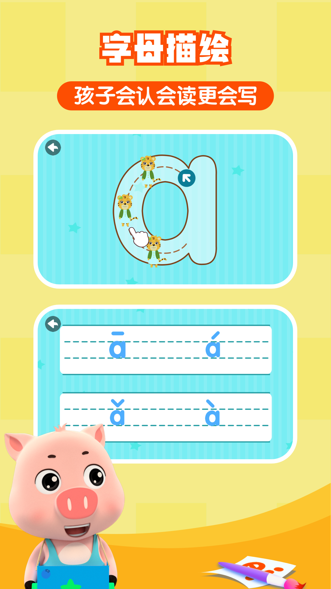 63个拼音全覆盖、126+拼读训练、63对词语卡片、30+互动游戏,从认、说、写、练四大维度,全面学习拼音字母知识!