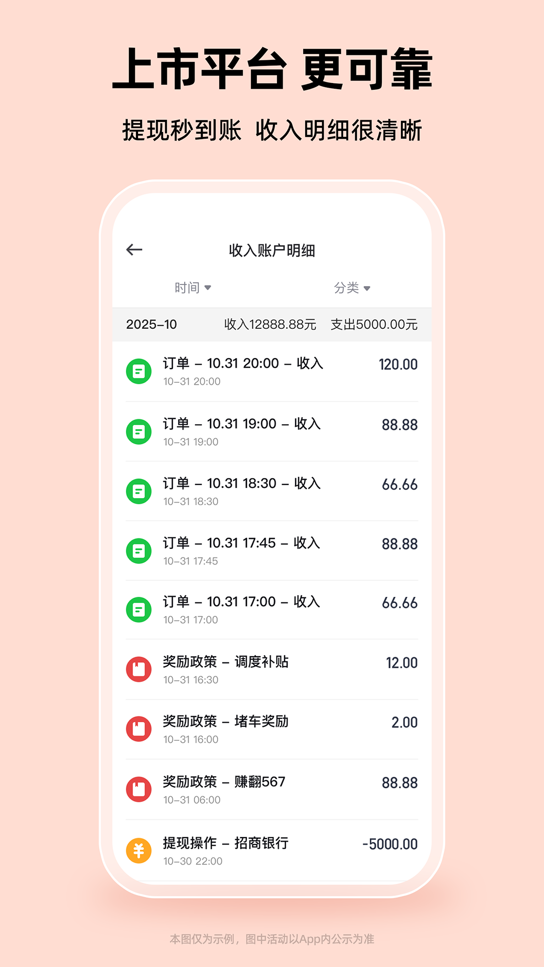 冲单奖励、高峰奖劢、流水奖励……奖励活动丰富;订单统计细致、结算周期自由选择。