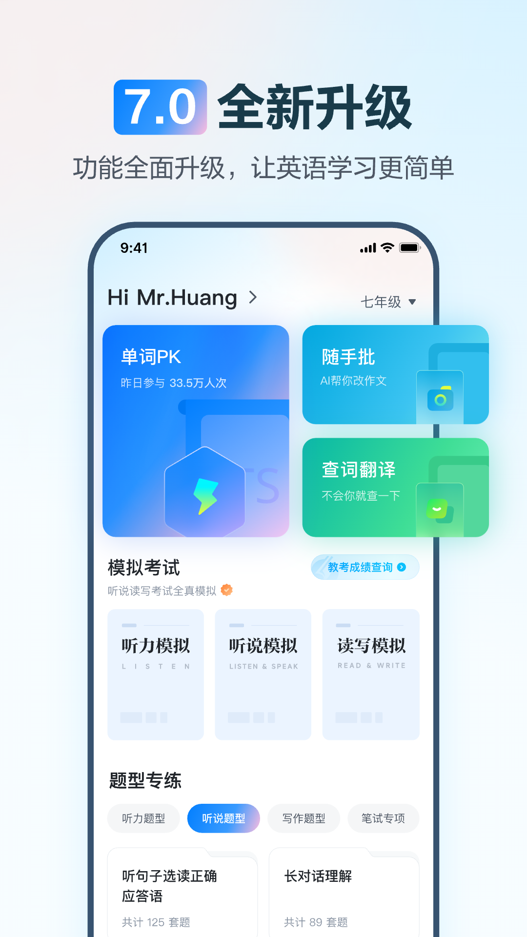 应用详情:E听说中学,是一款中学英语“听说读写”全学科备考产品,针对各地考纲有效命制内容,采用官方评测技术(科大讯飞语音评测技术和手写作文批改评分技术)高效评测,基于讯飞大数据智能计算技术打造智能练习平台、个性化学情图谱等领先功能,放心可信赖。