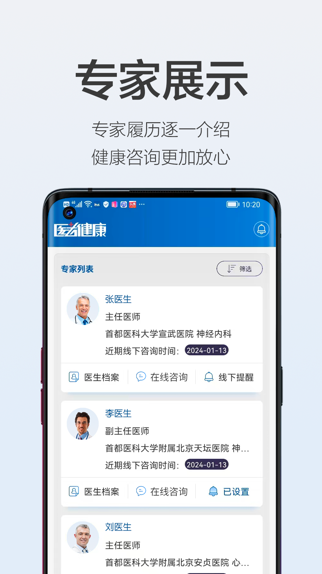 医者健康是一款对接国内心脑血管医疗团队的健康管理APP,管理团队均来自北京安贞、天坛医院的一线专家主任。以心脑血管慢病管理为核心打造国内权威管理平台,真确实现专家管理,维护您的心脑系统健康。