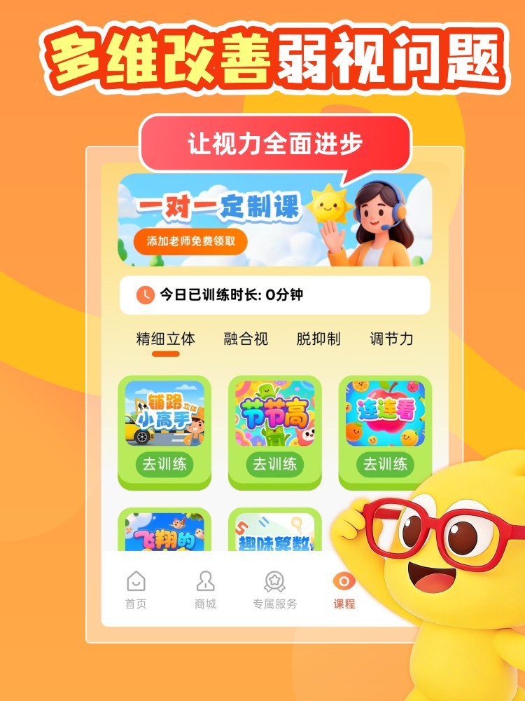 弱视训练APP,通过物理训练,与专业人工辅导老师指导,达到弱视增视目的,不仅是内容有趣,还结合协调以及益智类游戏。让训练课程和动脑相结合,从而帮助孩子弱视得到改善与矫正,孩子更喜欢!