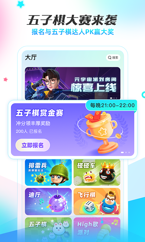 【小游戏玩法】新增五子棋大赛,在线匹配,好友PK等趣味玩法。