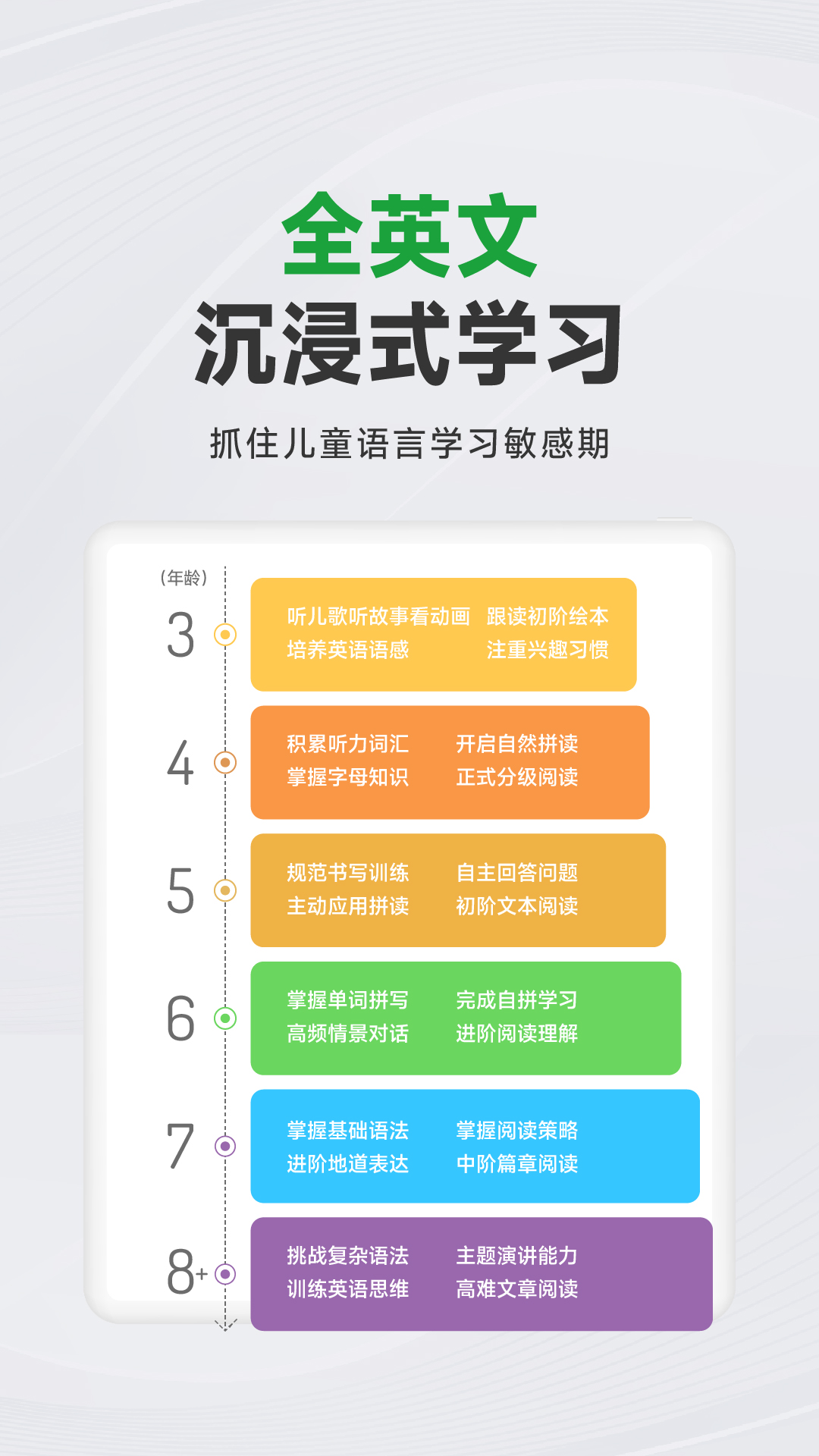 -难度螺旋式上升,针对不同年龄儿童,设计适合的学习内容与难度。
