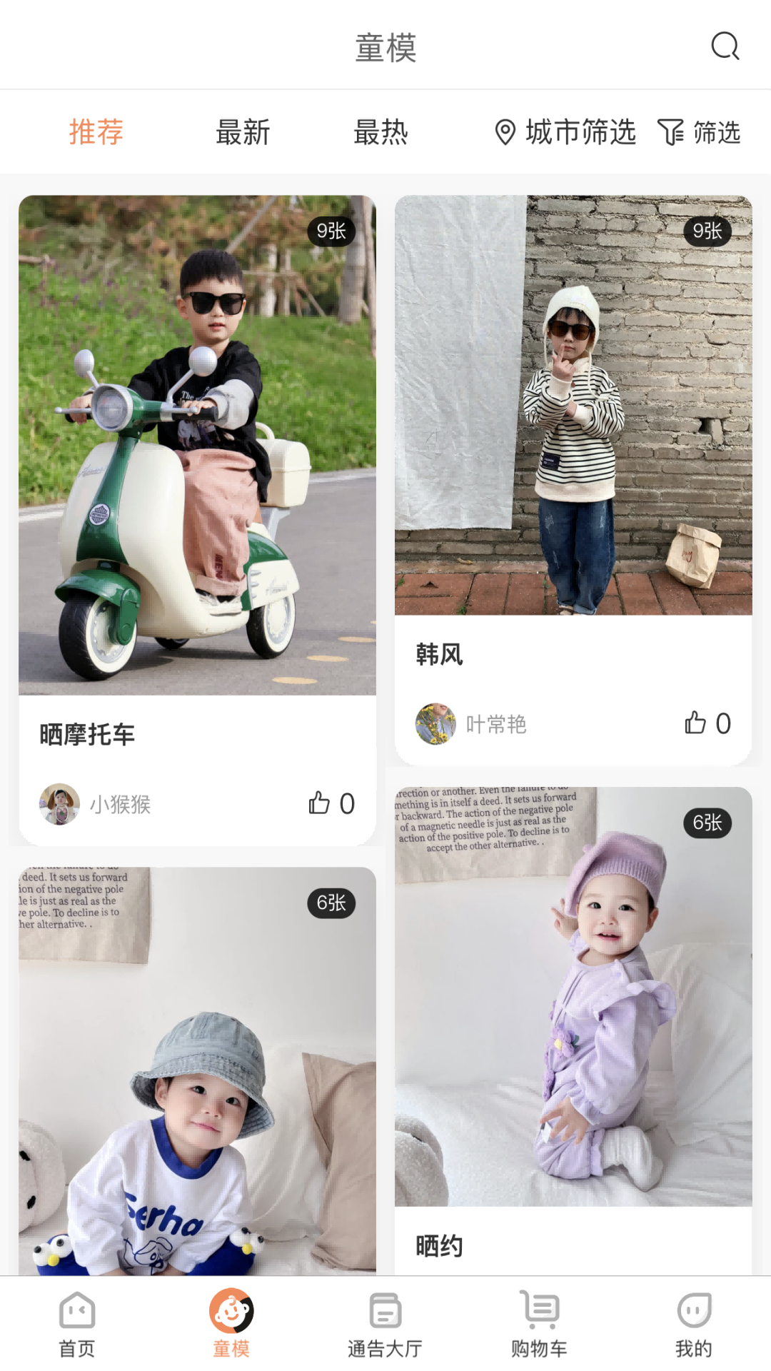 同时为需要模特的童装商家,提供免费的童模和摄影师招募活动通告发布平台,让商模对接更便捷。