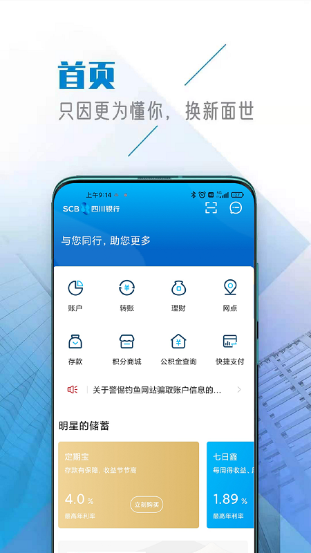 四川银行专为凉山地区客户打造移动金融服务平台,汇集新体验、新融合、新智能三大亮点,为您打造“智慧生活”用户体验的手机银行。