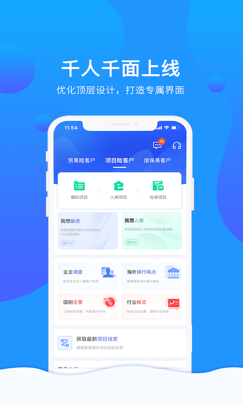 核心功能:提供信保视角国别、行业专业数据、保单一站式查询服务、业务情况一键统计分析、限额进度跟踪、海外买方资信红绿灯、项目融资模拟、项目库管理等多项核心服务,涵盖项目类和贸易类业务,线上服务“开箱即用”。