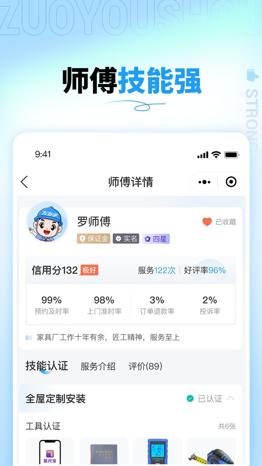 1、师傅技能多样;定制柜类、定制橱柜、门窗类等多个家居品类,安装、维修、测量样样精通。