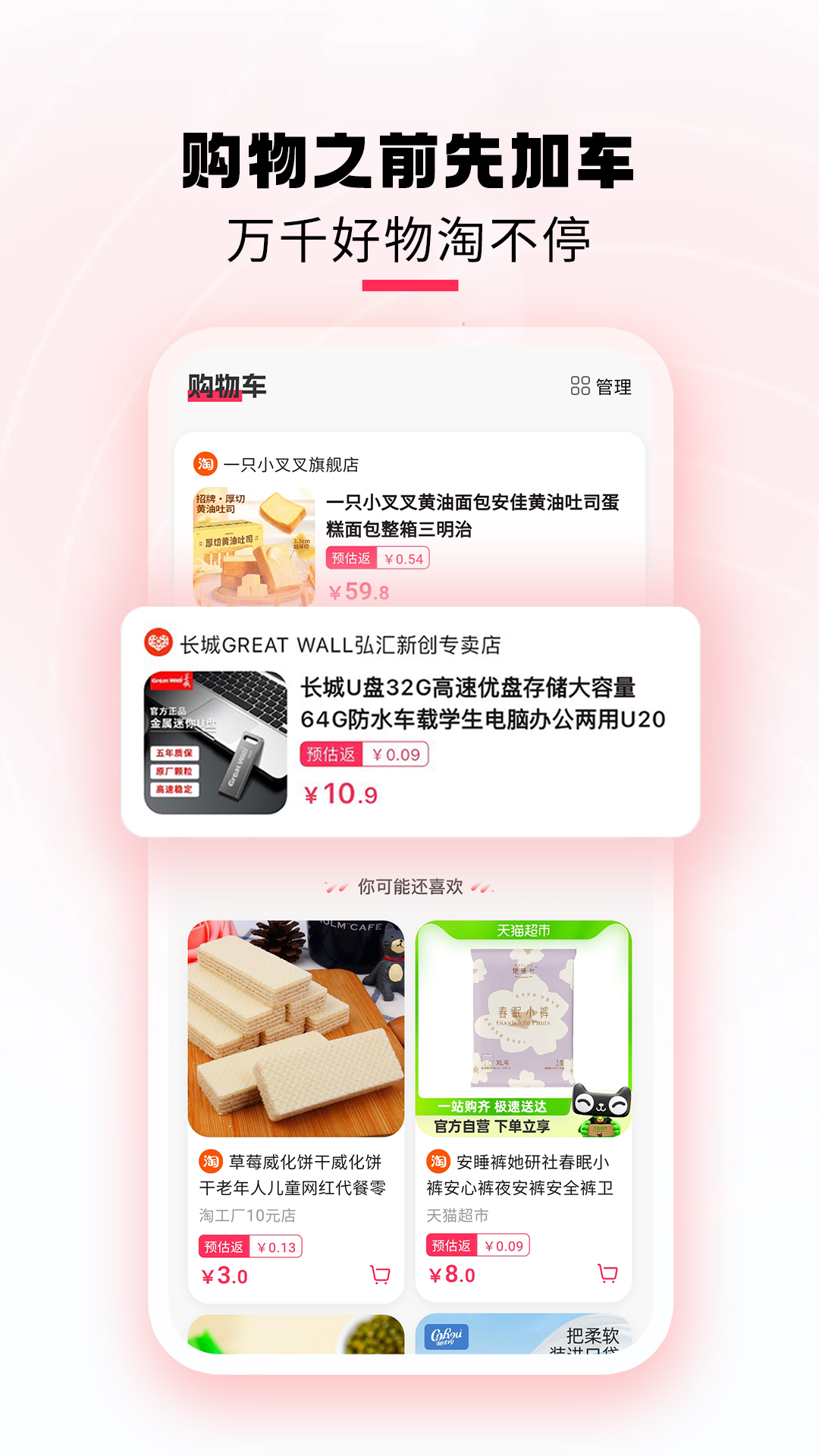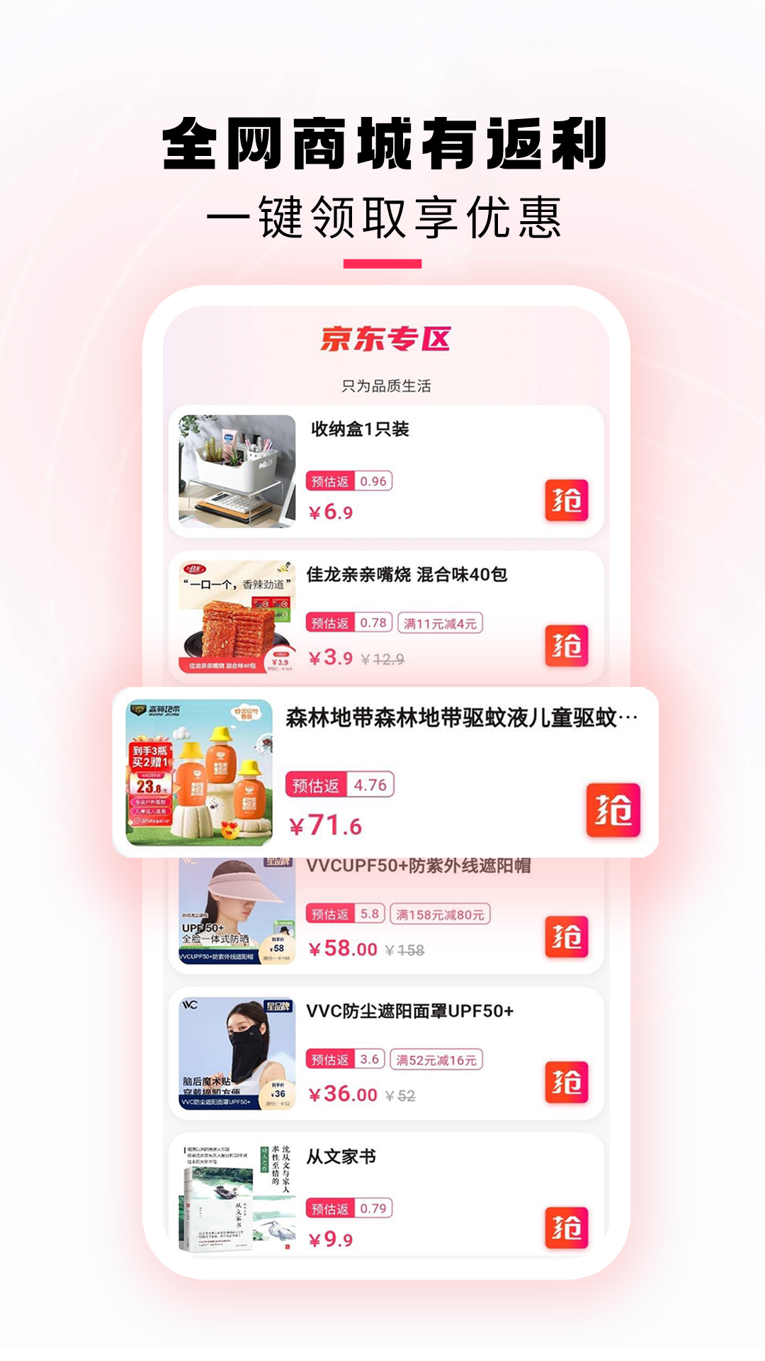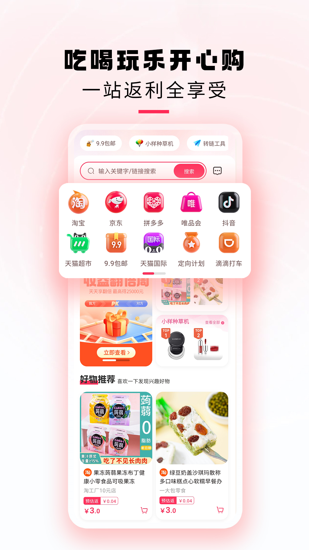 从淘宝、京东、拼多多等商城长按复制标题后粘贴到APP搜索,下单后即可拿到返利!