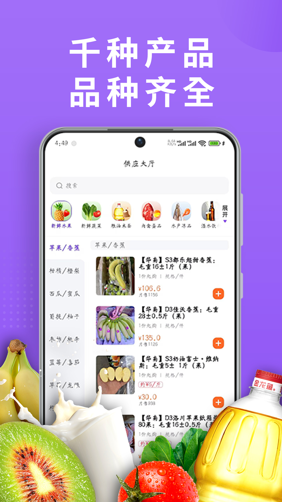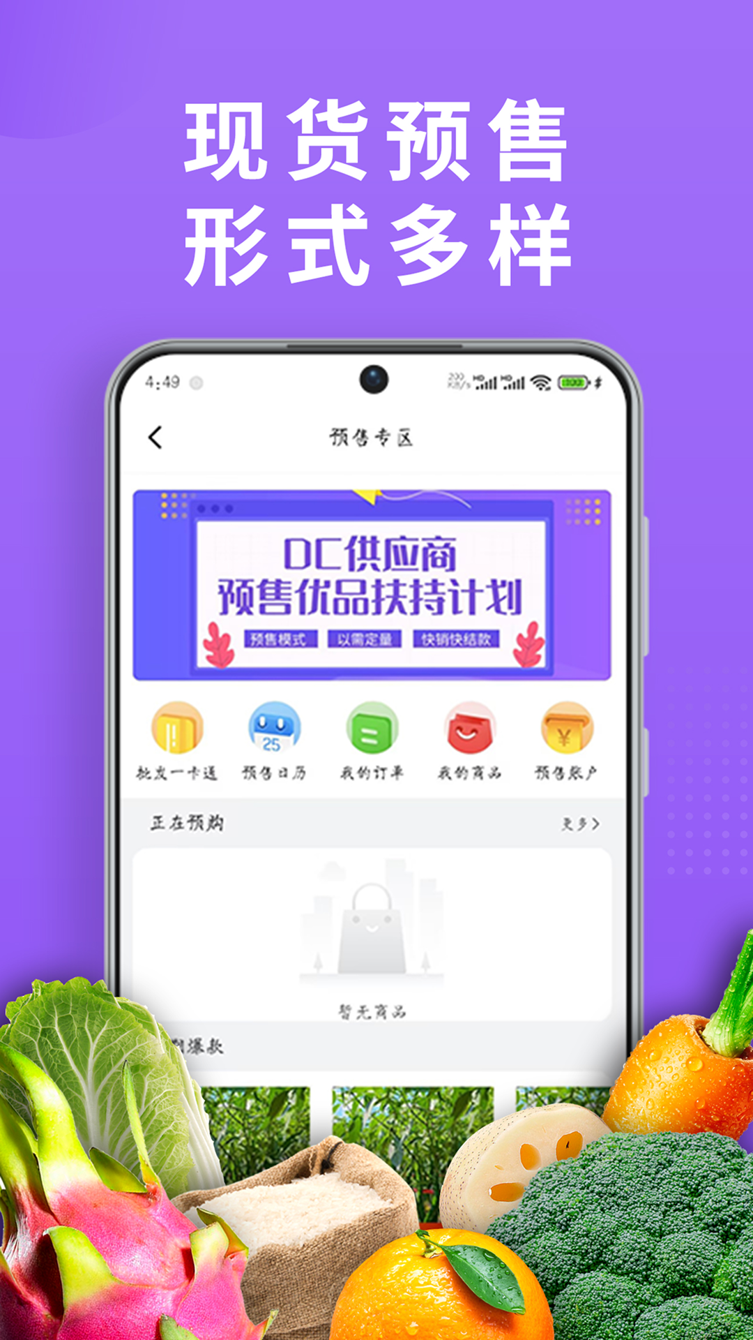 DC严选批发包含了生鲜水果、农产品批发、肉禽蛋、水产海鲜、米面粮油、休闲食品、日用百货等,入驻用户可以一键批发;形式包含现货和预售,用户可自主选择;同时平台也可以浏览各种农产品行业动态,实现了线上批发线下配送,同时具备客户购物、查询订单、搜索商品、行业资讯、会员注册登录等多种功能。