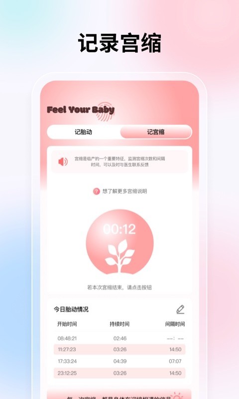 宫缩记录器,一款专门为孕妈妈制造的APP软件。为您提供贴心的数胎动/提醒胎动计数/数宫缩的功能, 还具有胎动的历史数据等记录, 助您掌握宝宝胎动规律, 确保胎儿健康成长。