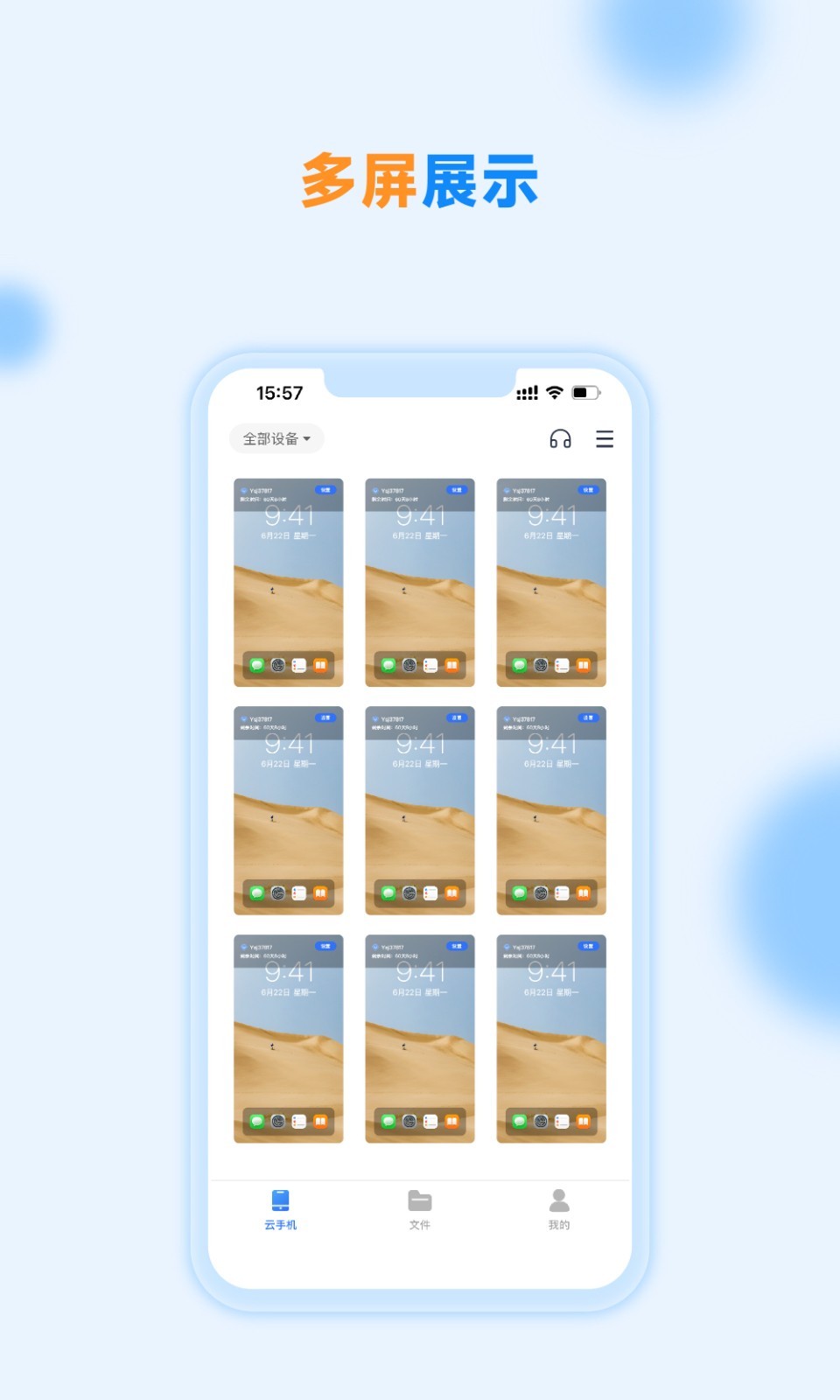 沐桦云手机有多个系统版本可供选择,包括Android7、10、12,更高配置8核+16G内存+256G存储。支持实时预览、多端互通、批量操作、拍照录屏,适配游戏托管、电子商务、视频、移动办公等多个场景。