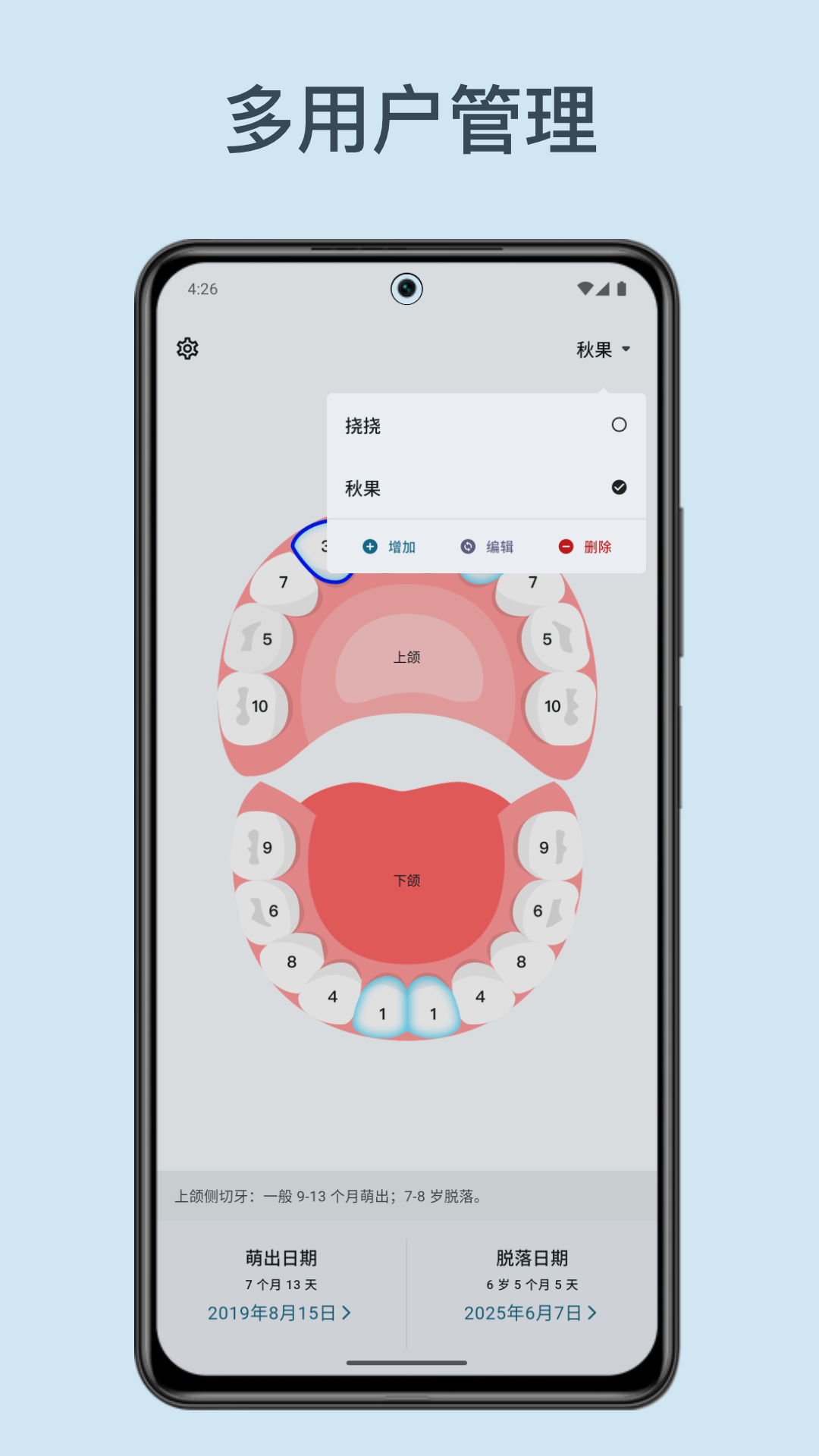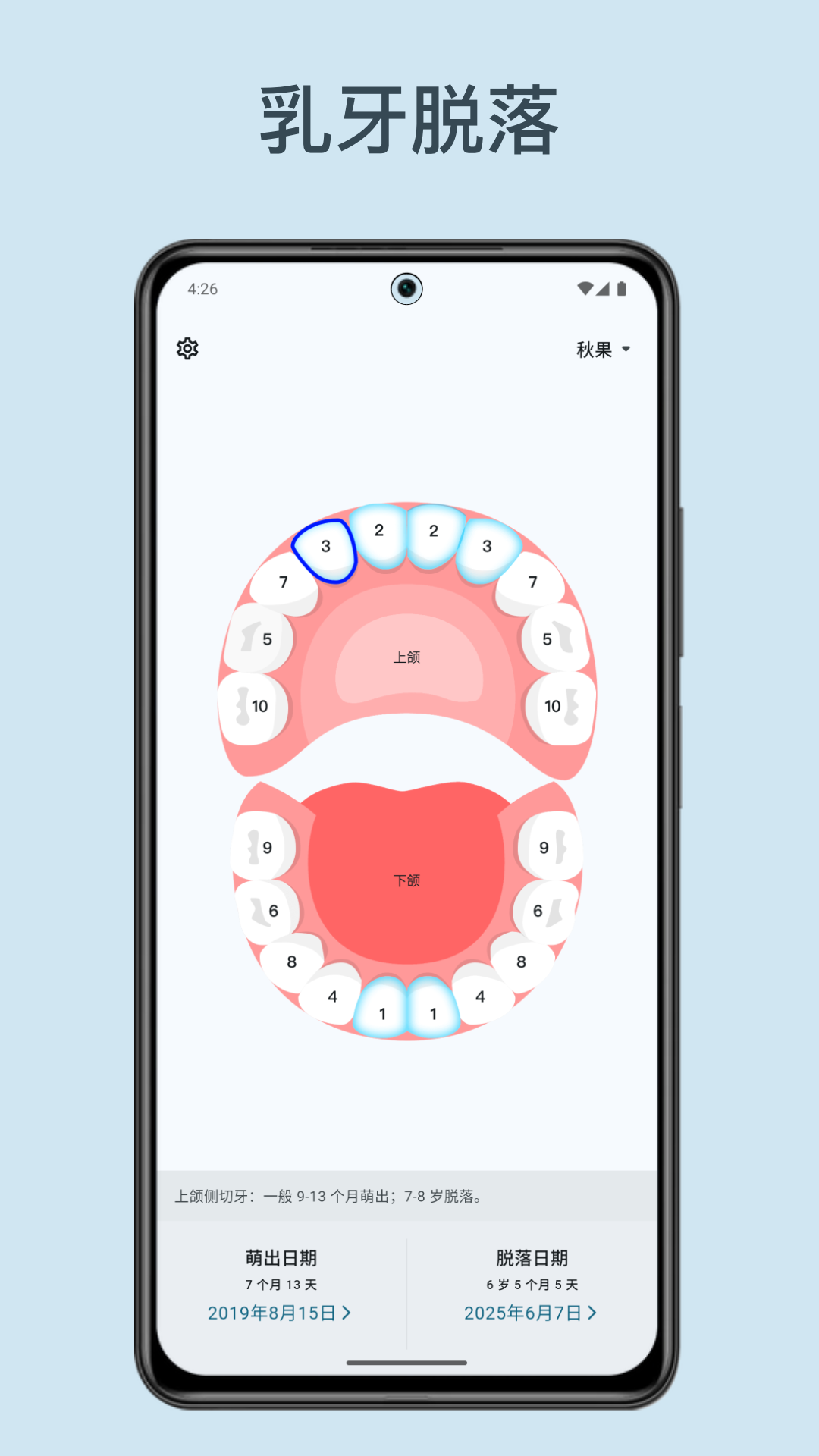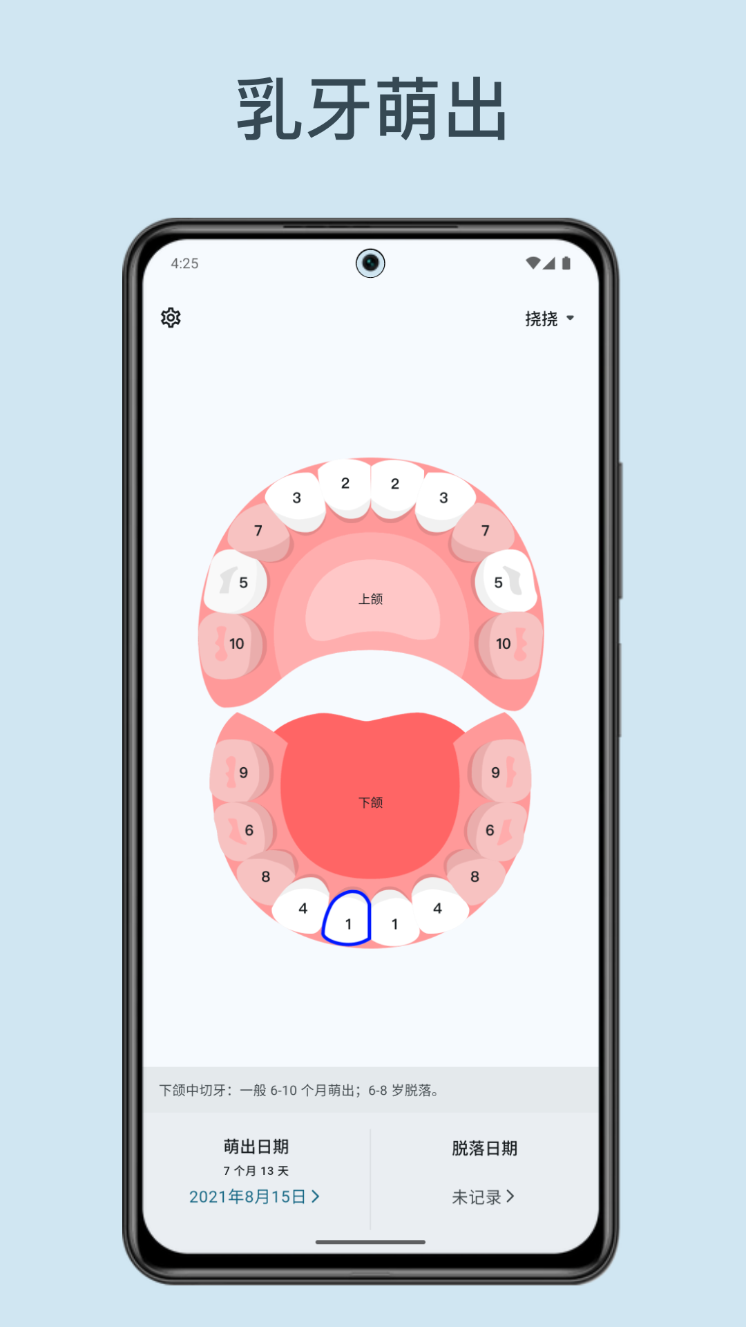 应用详情:轻松记录宝宝乳牙萌出和脱落,守护宝宝口腔健康。