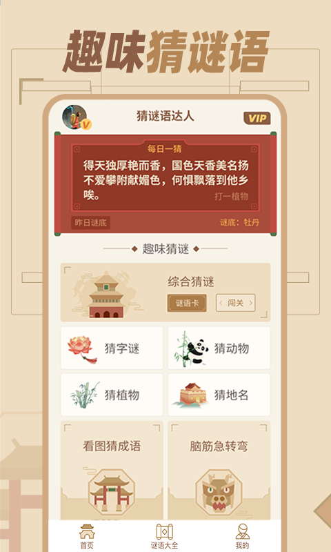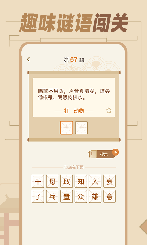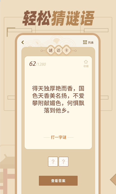 2.猜谜语达人包罗了数千个谜语题,有猜字谜、猜动物、猜植物、猜地名等,根据各种隐喻文字提示猜出谜底,通过关卡模式,让猜谜更具有挑战乐趣。