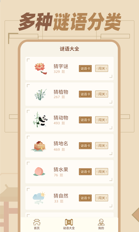4.整理了猜字谜、猜动物、猜植物、猜地名、猜水果、猜自然、猜物品和新春猜谜的分类,可以选择喜欢的分类畅玩。另外,还提供了搞笑的脑筋急转弯和烧脑的看图猜成语两种玩法。