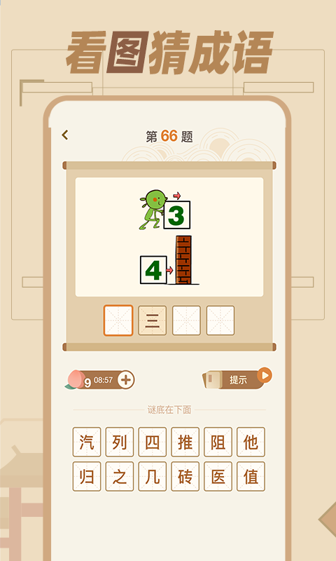 【看图猜成语】即看图猜谜,采用图片和成语结合效应,用户需要在看懂图片表达的意思后,猜出相对应的成语即可,图片妙趣横生,打开你的脑洞开始闯关吧!