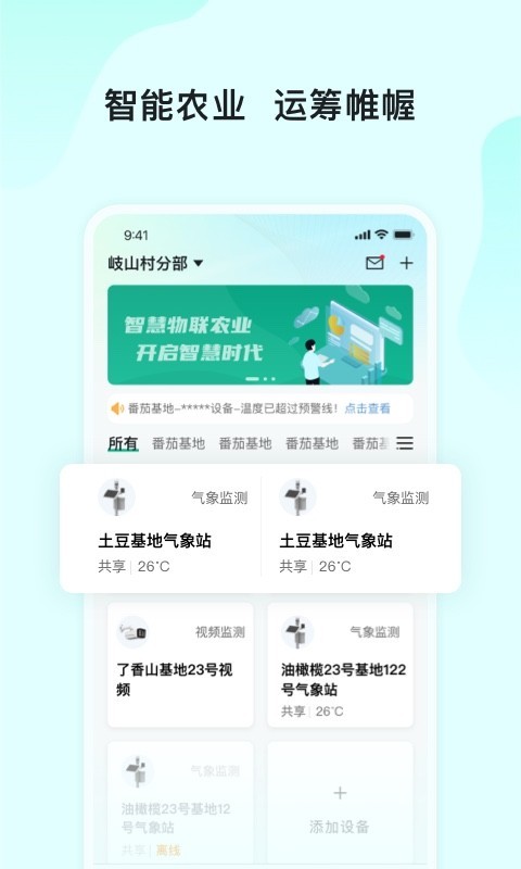 云上农业园,农业智能物联网应用软件,实现用户的农业智能设备自动化协同工作和远程控制 主要功能 •在任何地方远程控制农业物联网设备 •在地图中查看设备的坐标分布 •记录设备监测采集数据 •添加视频监控设备 •用户之间轻松共享和接收设备 •接收设备告警信息,保证农业生产安全