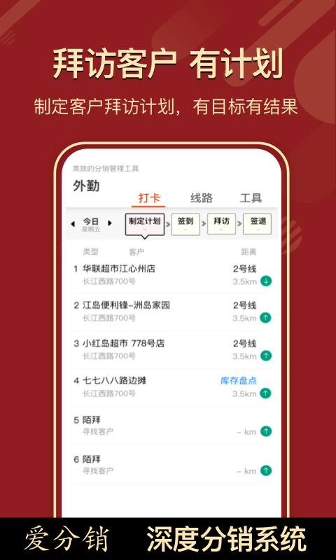 AI分销-外勤CRM是一款集外勤管理 SFA、客户管理 CRM 、经销商管理 DMS为一体的销售管理工具。 【经销商管理】 为品牌商,提供经客户拜访管理 SFA、终端门店管理、深度分销、费用管理 TPM、固定资产管理、经销商库存管理、销售终端动销分析等一体化深度分销运营工具。 【销售管理】 包含的销售管理工具有:拜访计划、外勤打卡、工作日报、经销商库存查询、商机管理。 【外勤crm】 致力于在外人员的外勤管理难题,提高工作效率,杜绝上班摸鱼,保证在岗真实性,外勤打卡全纪录。 【客户管理】 客户管理crm系统功能,一个软件解决公司客户和员工管理难题。 AI分销-外勤crm简单好上手,助力数万企业实现提人效,降费用