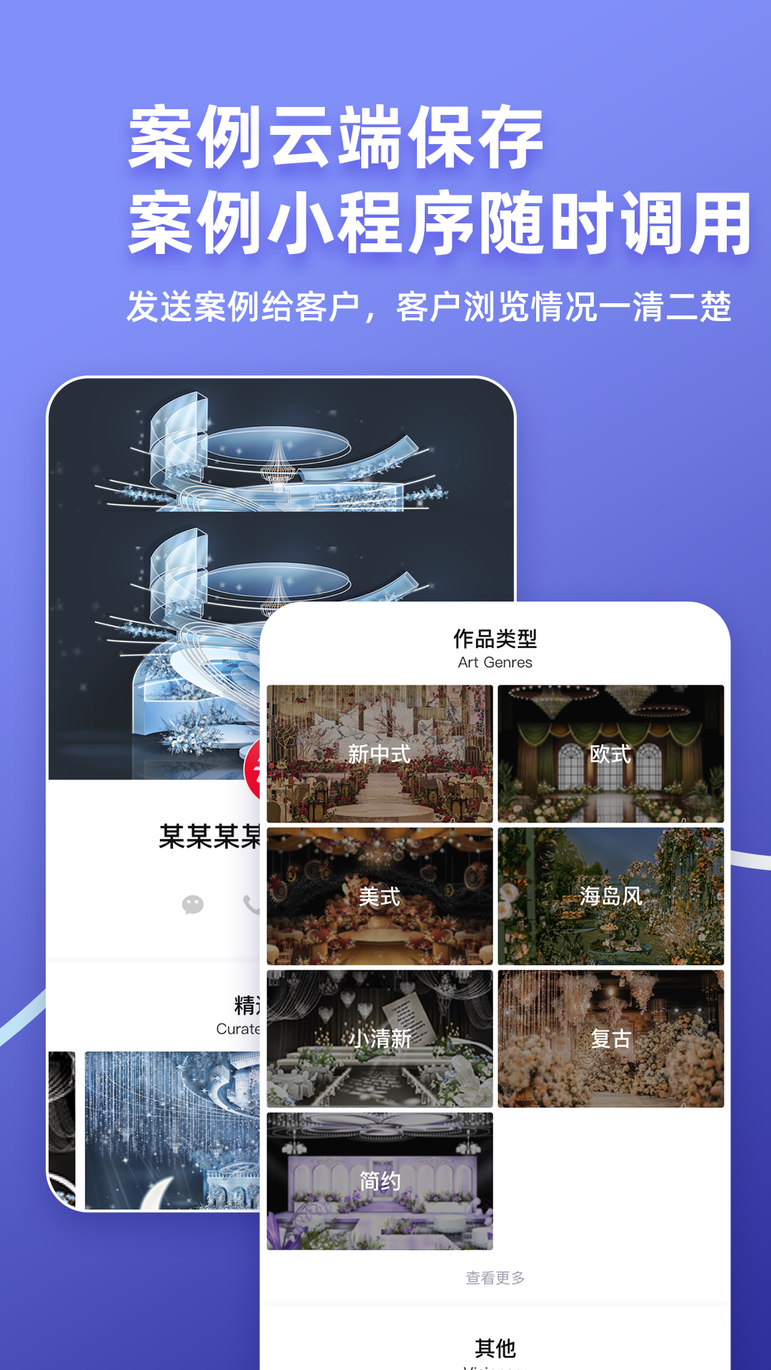 界面美观大方,专门用于在微信上给新人分享/发送案例使用,云来案例小程序具备无法下载原图,自动要求新人留资,阻止黑名单访问等能力。可以保护团队案例避免你原图流失,并且会将新人的浏览记录同步给app端,方便查看。