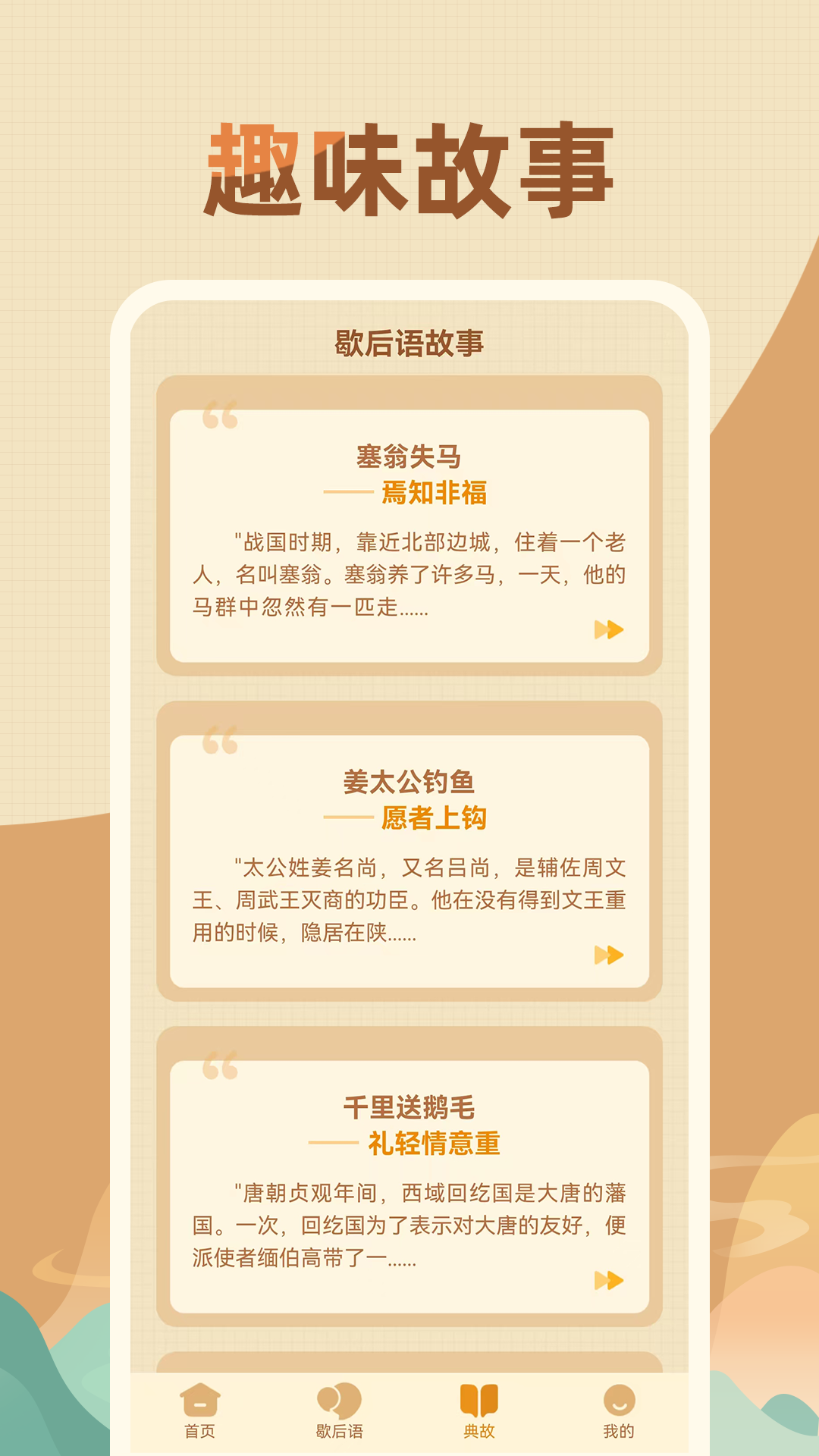 3.在歇后语栏目中,可以以知识卡片的形式学习歇后语;每日歇后语功能可以记录每天打卡和累计练习歇后语的记录;还可以通过歇后语故事了解更多歇后语知识和趣闻。