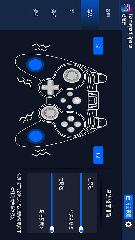 Gamepad Space是一款经过私有协议连接后可以自定义蓝牙手柄按键映射、按键连击、马达属性、按键宏、扳机按键死区、摇杆死区和摇杆映射等功能设置的的工具APP。通过修改自定义按键映射、按键连击、马达属性、按键宏、扳机按键死区、摇杆死区和摇杆映射等,使得键位适合玩家自己的操作习惯或匹配玩家想玩的游戏。