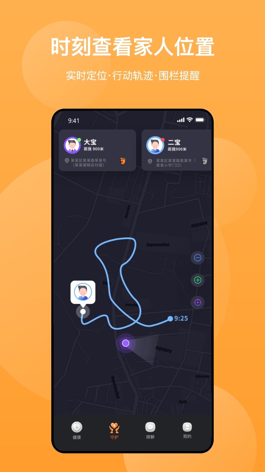 【守护】具备实时定位设备、SOS预警等安全功能,时刻守护用户安全。